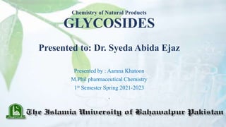 Glycosides are organic compounds found in many plants and animals that contain a sugar and non-sugar portion. They are classified based on the type of bond between the sugar and non-sugar parts. Some important examples of glycosides discussed in the document include digitalis containing cardioactive glycosides, aloe containing anthraquinone glycosides, licorice root containing saponin glycosides, and black mustard containing isothiocyanate glycosides. Glycosides have various pharmacological properties depending on their non-sugar portions, such as laxative, antiviral, antimicrobial, or cardiac effects.