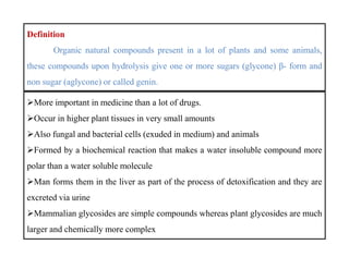 This document discusses glycosides, organic compounds found in plants and some animals that consist of sugars and non-sugar components. It details their classification, chemical properties, roles in medicine and plants, extraction methods, and specific examples such as senna glycosides. The text emphasizes glycosides' importance in pharmaceuticals, including their therapeutic effects and the extraction processes used to obtain them.