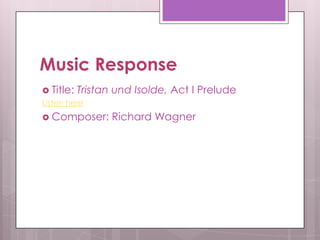 The document discusses Richard Wagner's opera Tristan und Isolde, providing links to listen to excerpts from Act I and Acts II and III. It also announces that next week students will begin creating puppets in class to perform a mini music drama based on a scene and characters from the opera, which will then be recorded and shared online.