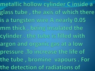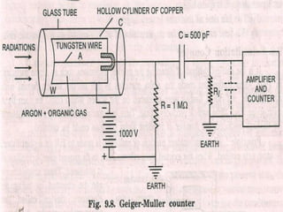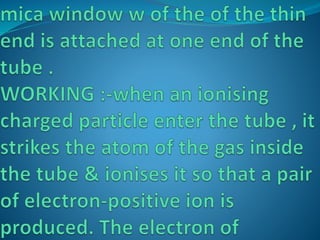 The Geiger-Muller counter is a device that detects and measures all types of radiation such as alpha, beta, and gamma radiation. It consists of a pair of electrodes with a high voltage between them. The gas used is usually helium or argon. When radiation particles enter the chamber, they ionize the gas atoms. This produces electrons that accelerate toward the anode and cause further ionization, creating an avalanche effect. To prevent continuous pulses, quenching is used to stop the successive avalanche amplification, such as by connecting an external resistance or using a specific gas. The electric field strength is calculated based on parameters like the anode voltage, wire and cylinder radii.