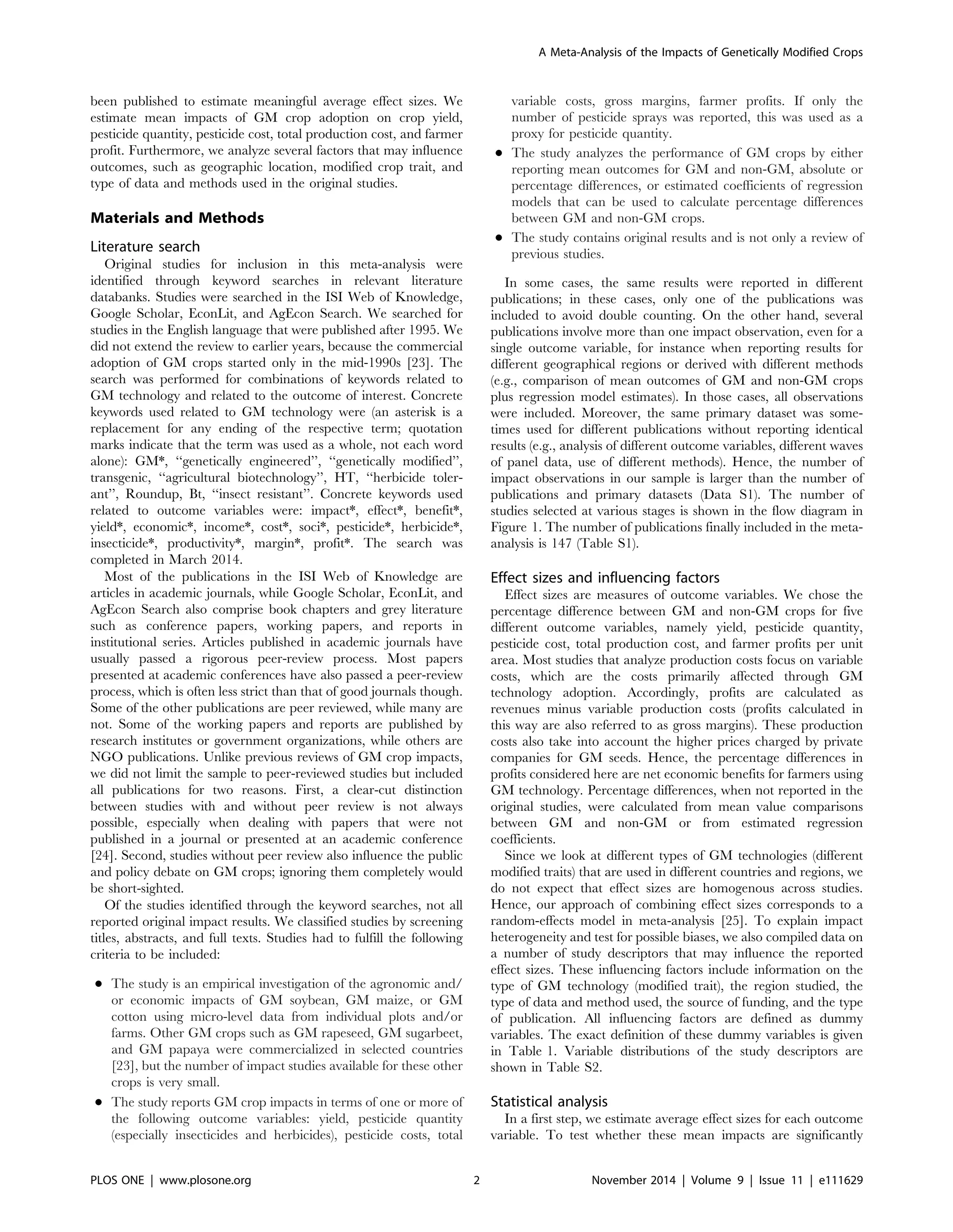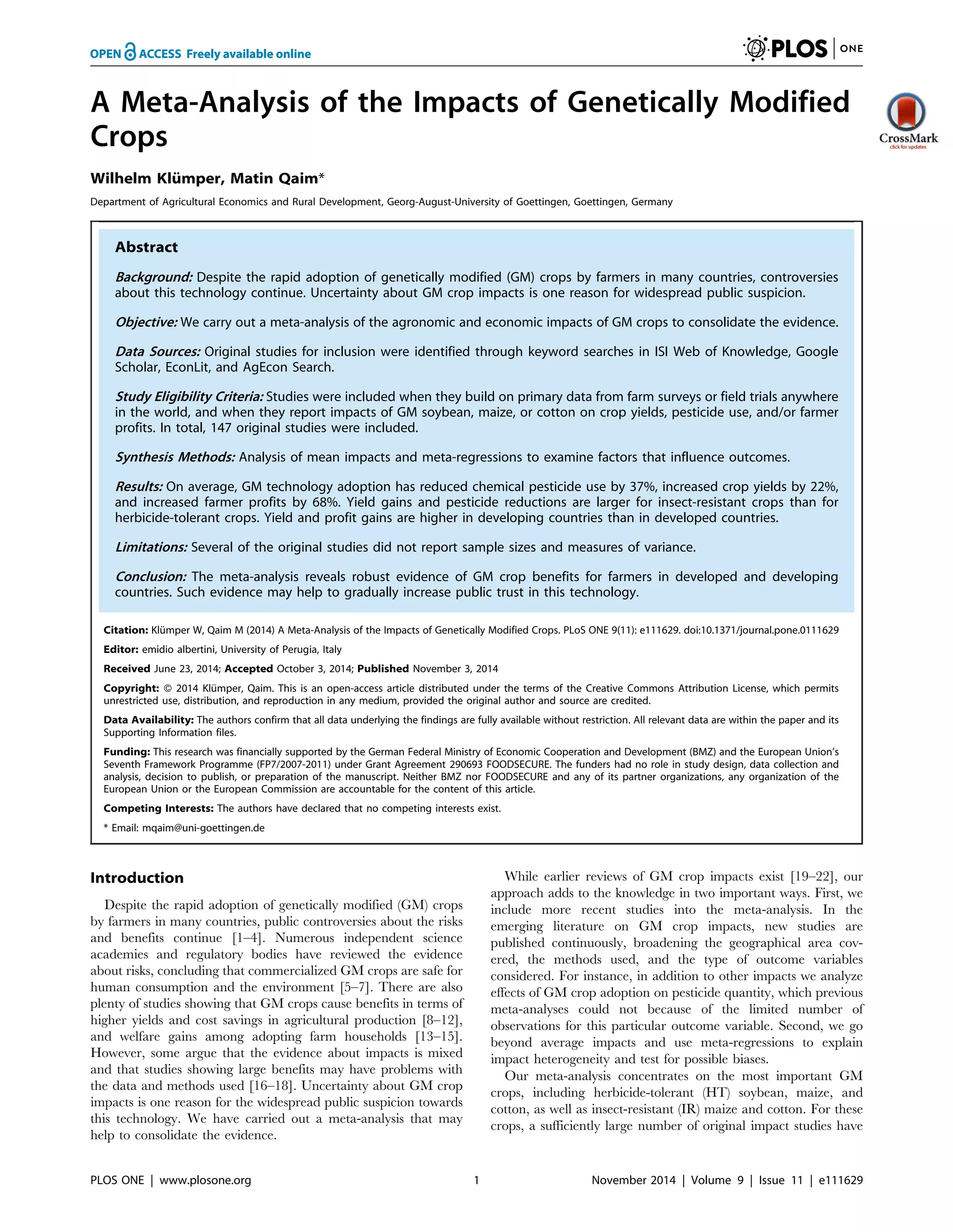 A meta-analysis of 147 studies investigates the agronomic and economic impacts of genetically modified (GM) crops, finding that GM adoption reduces pesticide use by 37%, increases crop yields by 22%, and boosts farmer profits by 68%. The analysis highlights higher gains for insect-resistant crops compared to herbicide-tolerant ones and indicates greater benefits in developing countries. The findings aim to consolidate evidence for GM crop benefits, potentially increasing public trust in this agricultural technology.