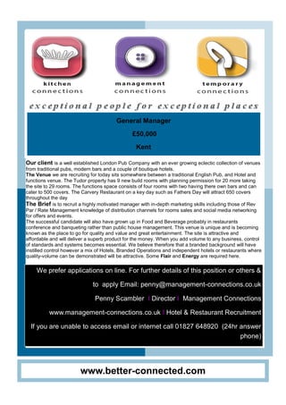 This job posting is for a General Manager position at a pub/hotel venue located in Kent, England. The venue operates as both a traditional English pub and functions venue that can host up to 500 guests. It also has 29 hotel rooms. The ideal candidate will have experience in food and beverage operations, preferably in restaurants, conference, and banqueting. They should also have skills in marketing, revenue management, and using social media. Applications can be submitted online or via phone.