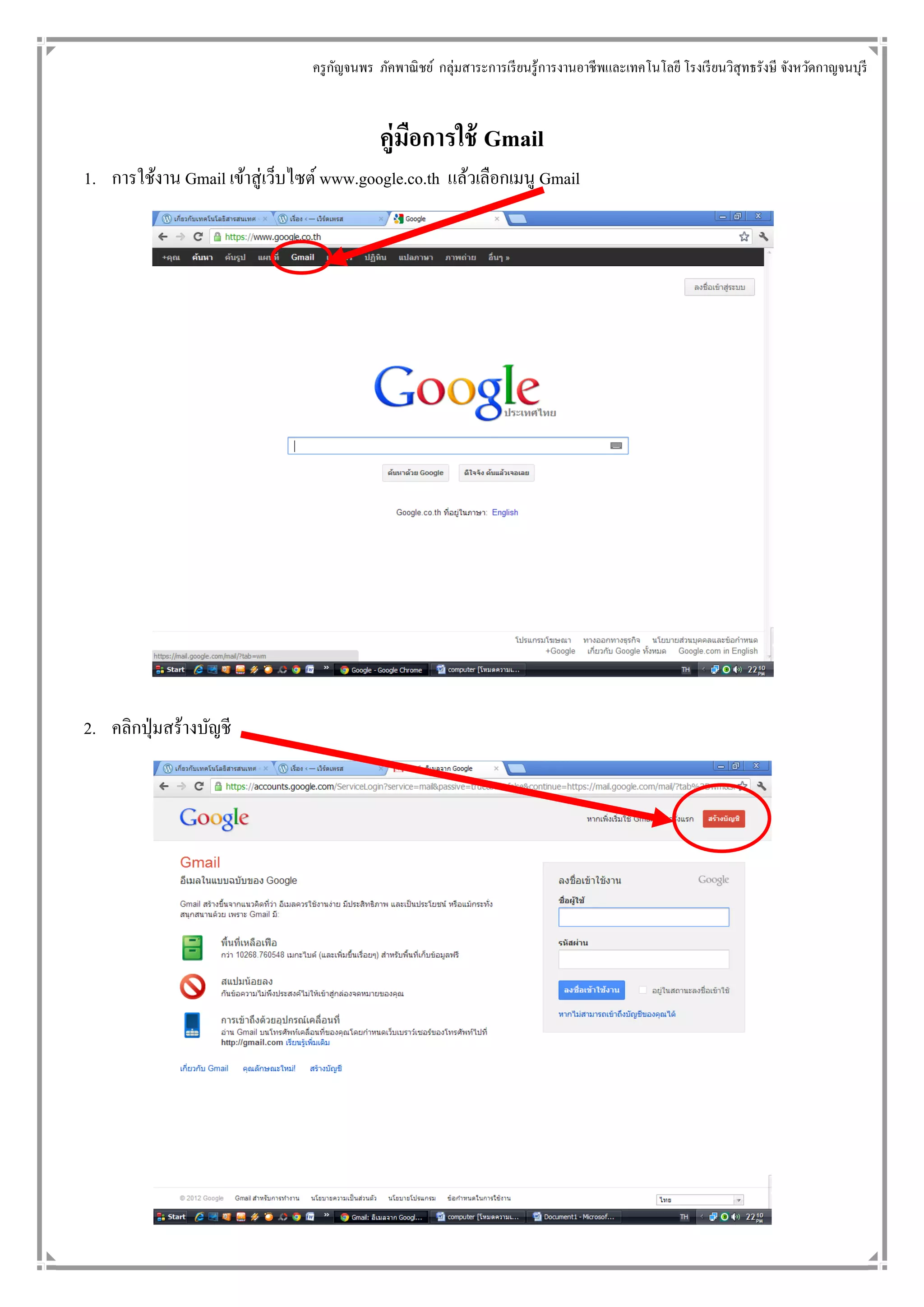 ชย์ กลุ่มสาระการเรี ยนรู้การงานอาชี พและเทคโนโลยี โรงเรี ยนวิสุทธรังษี จังหวัดกาญจนบุรี ั คู่มือการใช้ Gmail 1. การใช้งาน Gmail เข้าสู่ เว็บไซต์ www.google.co.th แล้วเลือกเมนู Gmail 2. คลิกปุ่ มสร้างบัญชี