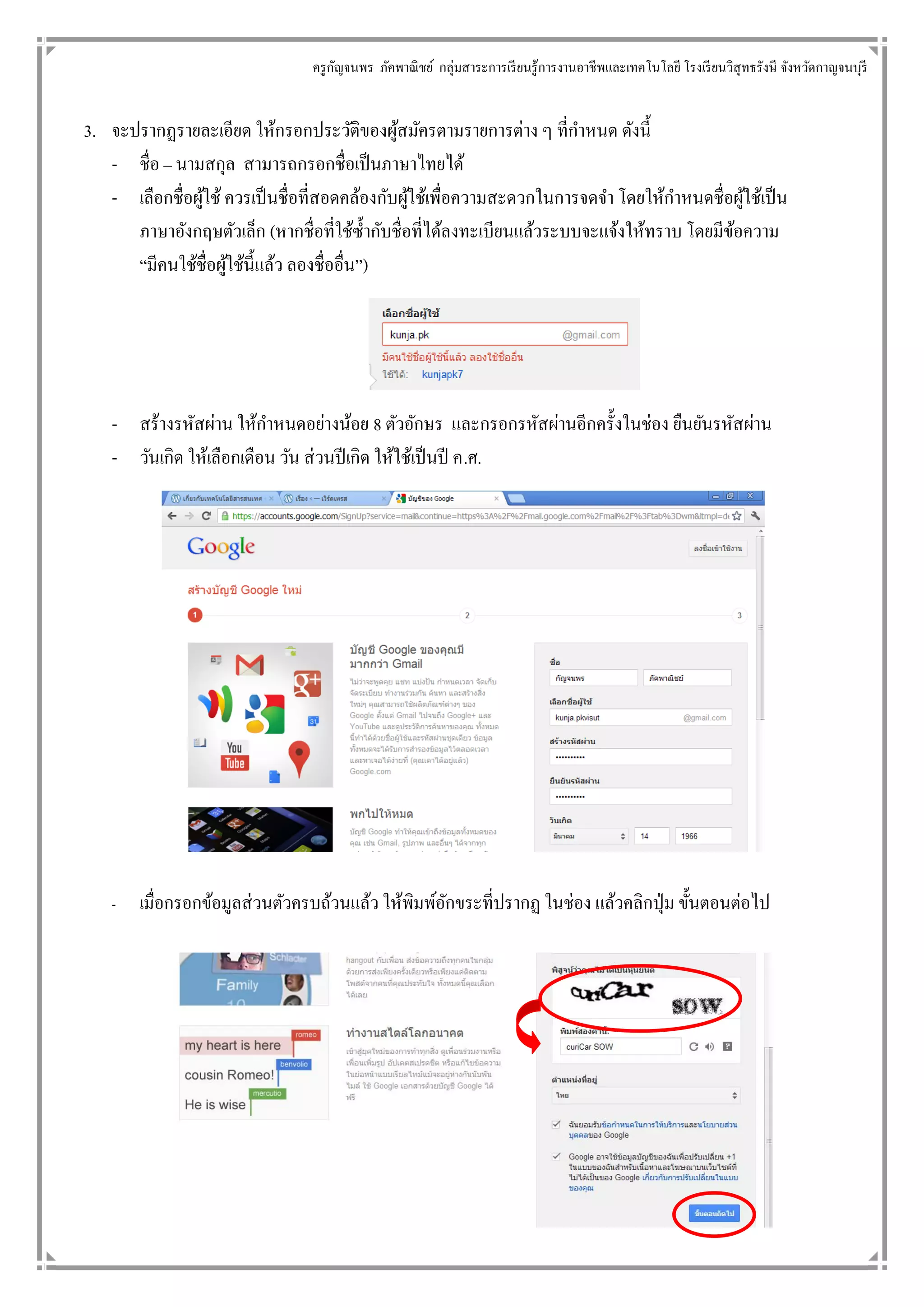 ชย์ กลุ่มสาระการเรี ยนรู้การงานอาชี พและเทคโนโลยี โรงเรี ยนวิสุทธรังษี จังหวัดกาญจนบุรี ั 3. จะปรากฏรายละเอียด ให้กรอกประวัติของผูสมัครตามรายการต่าง ๆ ที่กาหนด ดังนี้ ้ - ชื่อ – นามสกุล สามารถกรอกชื่อเป็ นภาษาไทยได้ - เลือกชื่อผูใช้ ควรเป็ นชื่อที่สอดคล้องกับผูใช้เพื่อความสะดวกในการจดจา โดยให้กาหนดชื่อผูใช้เป็ น ้ ้ ้ ภาษาอังกฤษตัวเล็ก (หากชื่อที่ใช้ซ้ ากับชื่อที่ได้ลงทะเบียนแล้วระบบจะแจ้งให้ทราบ โดยมีขอความ ้ “มีคนใช้ชื่อผูใช้น้ ีแล้ว ลองชื่ออื่น”) ้ - สร้างรหัสผ่าน ให้กาหนดอย่างน้อย 8 ตัวอักษร และกรอกรหัสผ่านอีกครั้งในช่อง ยืนยันรหัสผ่าน - วันเกิด ให้เลือกเดือน วัน ส่ วนปี เกิด ให้ใช้เป็ นปี ค.ศ. - เมื่อกรอกข้อมูลส่ วนตัวครบถ้วนแล้ว ให้พิมพ์อกขระที่ปรากฏ ในช่อง แล้วคลิกปุ่ ม ขั้นตอนต่อไป ั