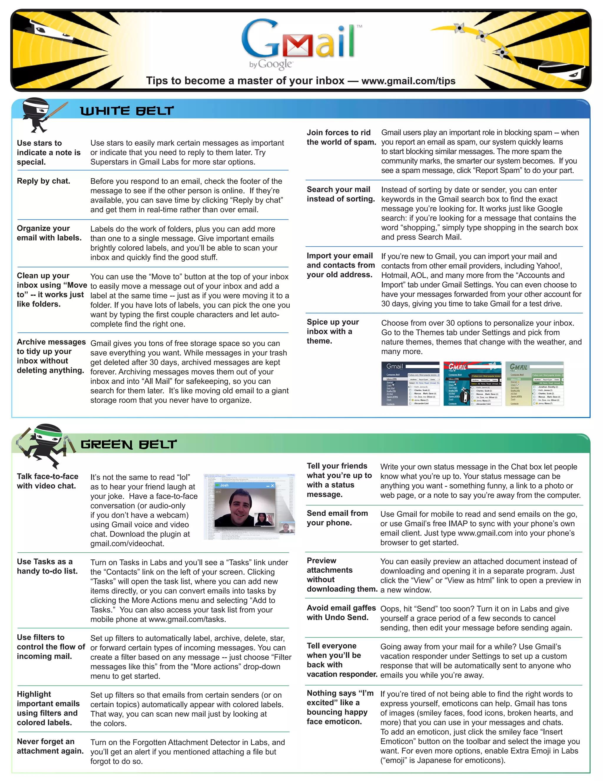 1) The document provides tips for using Gmail more efficiently, such as using stars and labels to organize emails, searching emails instead of sorting, and using keyboard shortcuts to navigate faster.