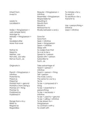 The document discusses various prepositions, conjunctions, verbs and grammatical structures used to connect ideas, compare and contrast concepts, attribute causation or responsibility, and discuss relationships between people, things, ideas and events. It provides examples of how different parts of speech are used in natural language to discuss complex topics and develop coherent narratives.