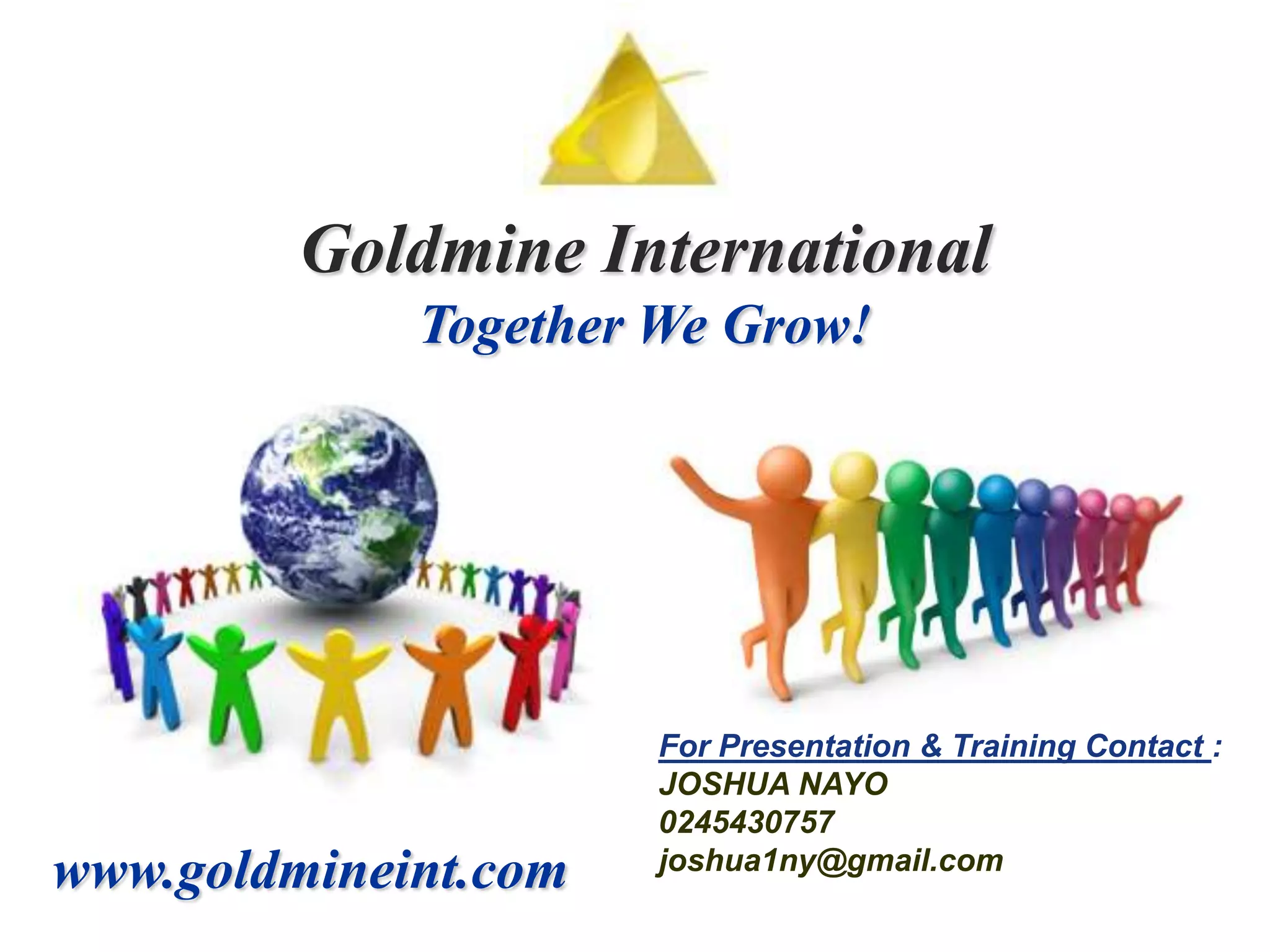 This document provides information about the Goldmine International company and its network marketing business opportunities. It describes Goldmine International as offering a way to achieve financial freedom and security through network marketing. It promotes the 3/3 Advance Gold Plan, which allows potential earnings of up to $450 per day. It provides contact information for Joshua Nayo to join the business opportunity.
