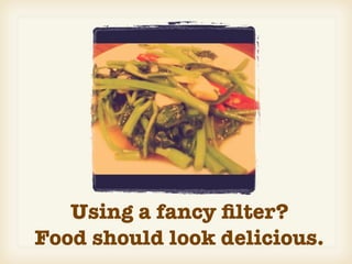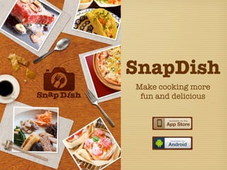 SnapDish is a mobile app for sharing homemade recipes and food photos. It allows users to take photos of dishes they cook, apply filters, and share the photos along with the recipes. The app has grown steadily with over 350,000 downloads and growing activity among users in Japan, other Asian countries, and overseas. The company aims to partner with food and beverage brands for sponsorship and data opportunities. It has received positive press coverage and seen success partnering with companies in Japan and other Asian markets to continue its growth.