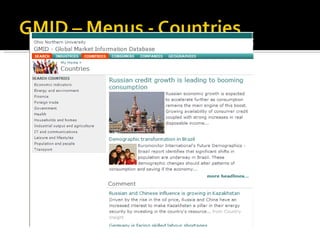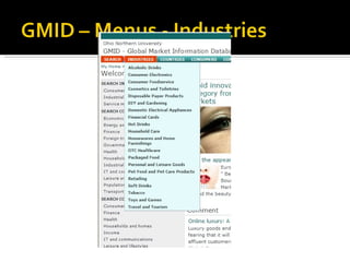 ![http://www.onu.edu/library/ Reference librarians on duty 8a-4p, 6-9p Monday – Thursday, 8a-4p Friday and 10a-3:30p Sundays, One-on-one sessions available by appointment Email [email_address] Phone 2473 Instant Messaging Chat Reference](https://image.slidesharecdn.com/gmid-globalmarketinformationdatabase-111019082224-phpapp02/85/GMID-global-market-information-database-16-320.jpg)
