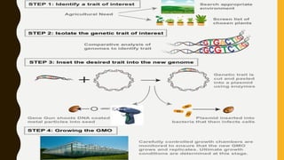 Genetic engineering is a technique used to alter or move genetic material from living cells. A genetically modified organism (GMO) is any organism whose genetic material has been altered using genetic engineering. The first GMO was a mouse created in 1973 by transferring antibiotic resistance genes into its genome. Since then, scientists have genetically modified many other organisms like plants, animals and microbes by inserting genes from different species. While GMOs aim to improve traits like disease resistance and yield, some argue they may cause unintended health or environmental risks.