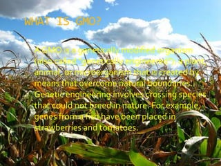 Genetically modified organisms (GMOs) are organisms whose genetic material has been altered using genetic engineering techniques. This summary will discuss some of the potential disadvantages of GMOs. GMOs carry risks such as unintended gene transfer between crops and other plants, which could harm the environment. They may also introduce new allergens in food crops that could impact human health. While GMOs aim to increase crop yields and reduce costs, their widespread use could also lead to economic dependence on corporations that produce GMOs and control agricultural industries. There are also ethical concerns regarding genetic modification playing God and causing undue stress to animals used in research. Overall, there is ongoing debate around both the advantages and disadvantages of GMOs.