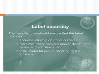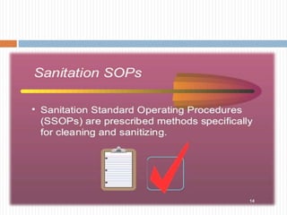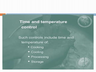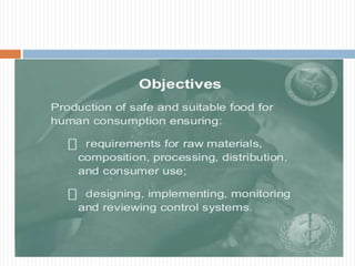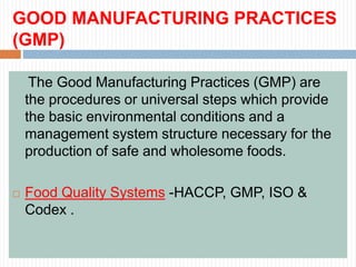 The document provides an overview of Good Manufacturing Practices (GMP). It discusses that GMPs are procedures and universal steps that provide basic environmental conditions and management systems necessary for safe food production. It outlines 10 key areas of GMP including facilities, equipment, water supply, waste disposal, cleaning, and personnel practices. The document emphasizes that GMPs focus on preventative measures and each facility must implement supervision and monitoring systems to ensure food safety.
