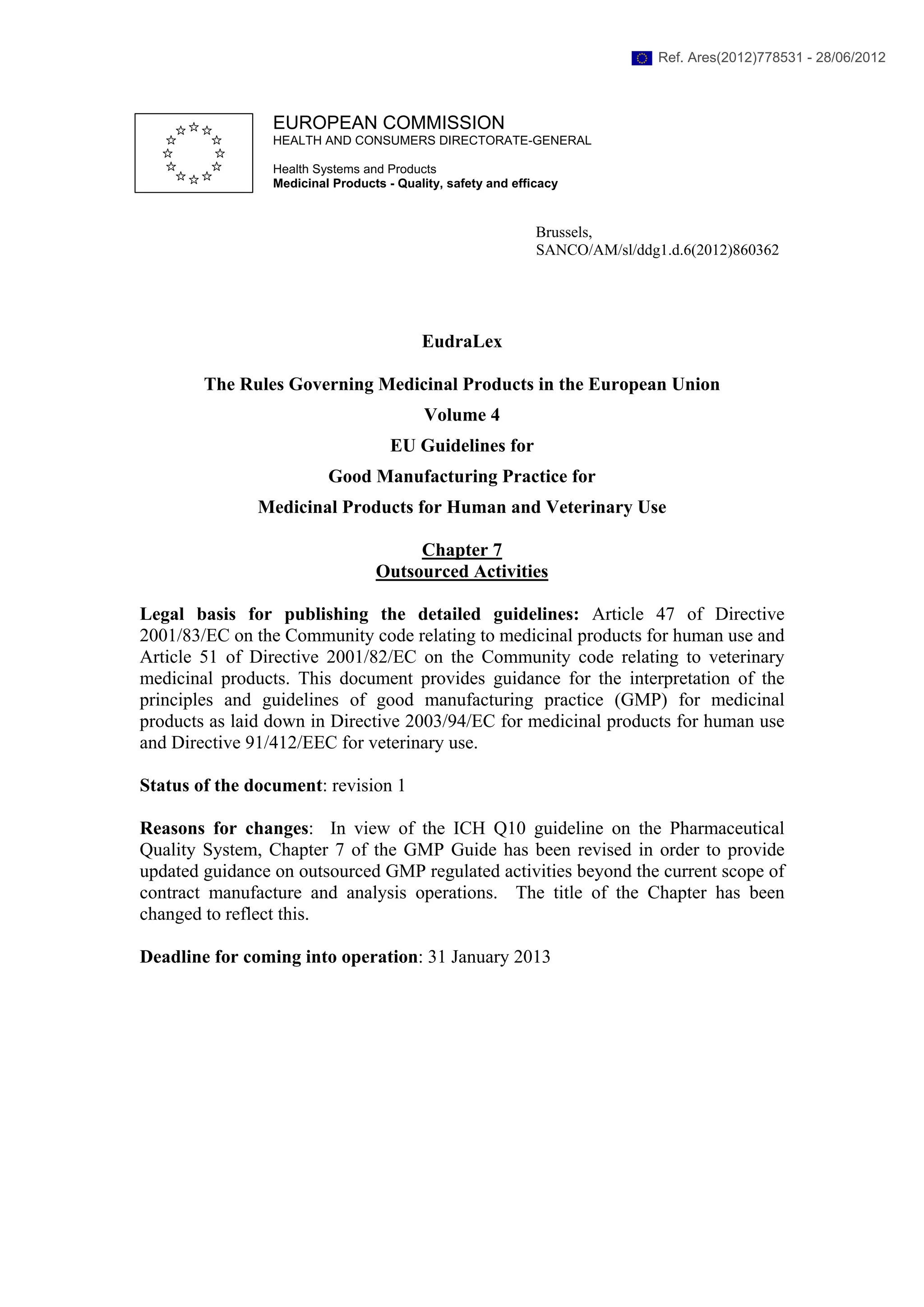 This document provides updated guidance on outsourced GMP regulated activities beyond just contract manufacturing and analysis. It outlines responsibilities for both the contract giver and acceptor. The contract giver is ultimately responsible for ensuring outsourced activities are properly controlled and compliant with GMP. There must be a written contract between the two parties defining their duties and technical arrangements. All outsourced activities, including any subcontracting, must follow regulations and marketing authorizations. Records must be accessible to the contract giver to allow for compliance oversight.