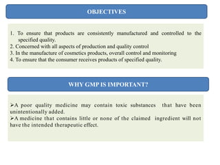 Good Manufacturing Practices (GMP) regulations were introduced in 1988 and amended in 2001 to ensure pharmaceutical products are consistently produced and controlled according to quality standards. GMP covers all aspects of production from starting materials to training and hygiene of staff. Detailed written procedures and documented proof of following correct procedures are required at each step of manufacturing. The goal is to minimize risks that cannot be detected by final testing and ensure consumers receive products of the specified quality.
