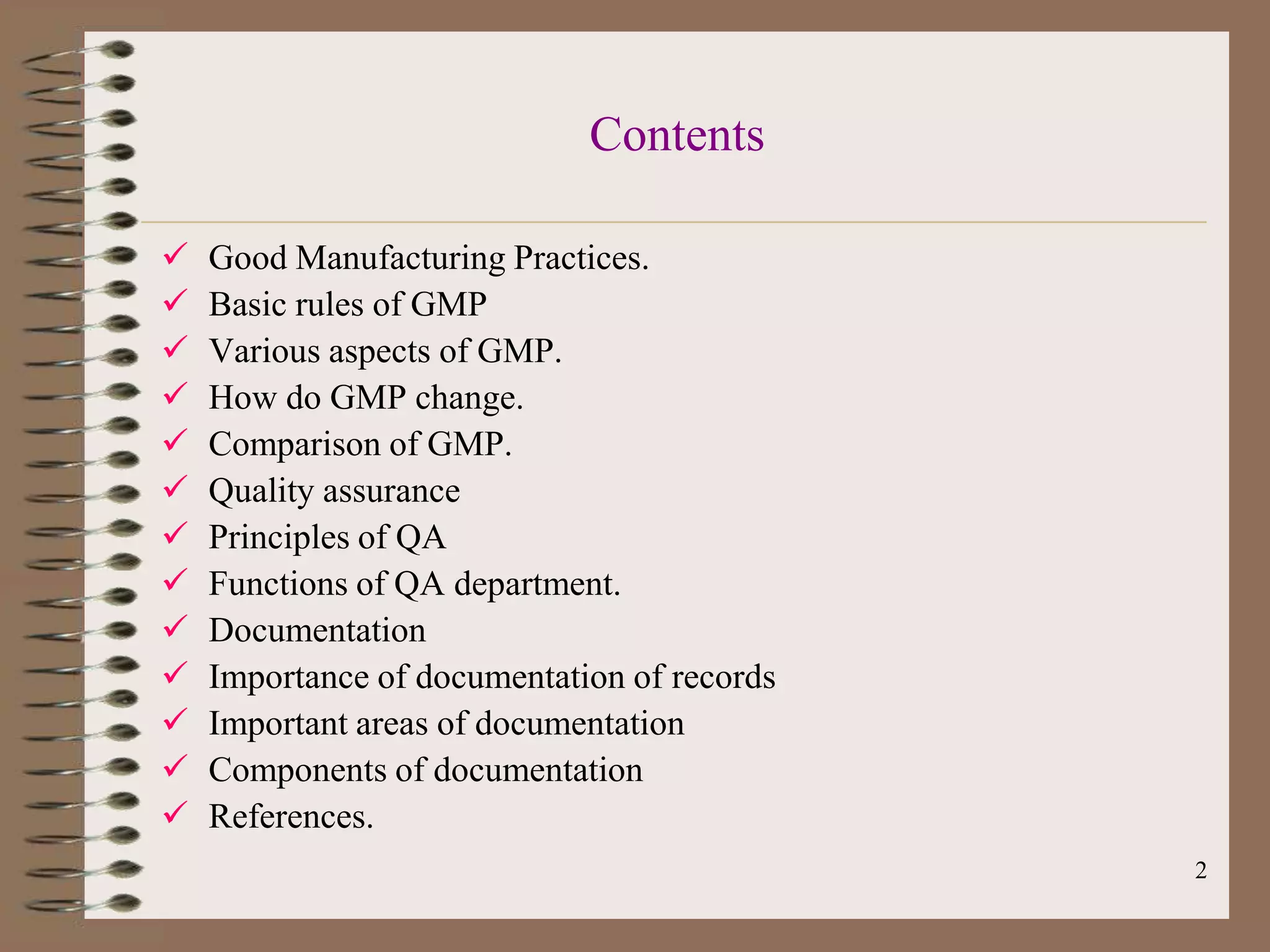 The document discusses Good Manufacturing Practices (GMP) and Quality Assurance principles in pharmaceutical production, emphasizing the importance of quality at every manufacturing stage to ensure safety and efficacy. It outlines key aspects of GMP, including personnel qualifications, facility design, raw material handling, equipment maintenance, and documentation protocols. The document also highlights the functions of the Quality Assurance department, including batch production record reviews, complaint handling, and ensuring compliance with regulatory standards.