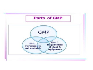 The document discusses Good Manufacturing Practices (GMP) for pharmaceutical manufacturing. It outlines requirements for facilities, equipment, personnel, documentation, production processes, quality control, and other operational aspects to minimize risks and ensure consistent production of quality products. GMP covers all aspects of production and testing to maintain standards, prevent contamination and errors, and comply with regulatory guidelines.