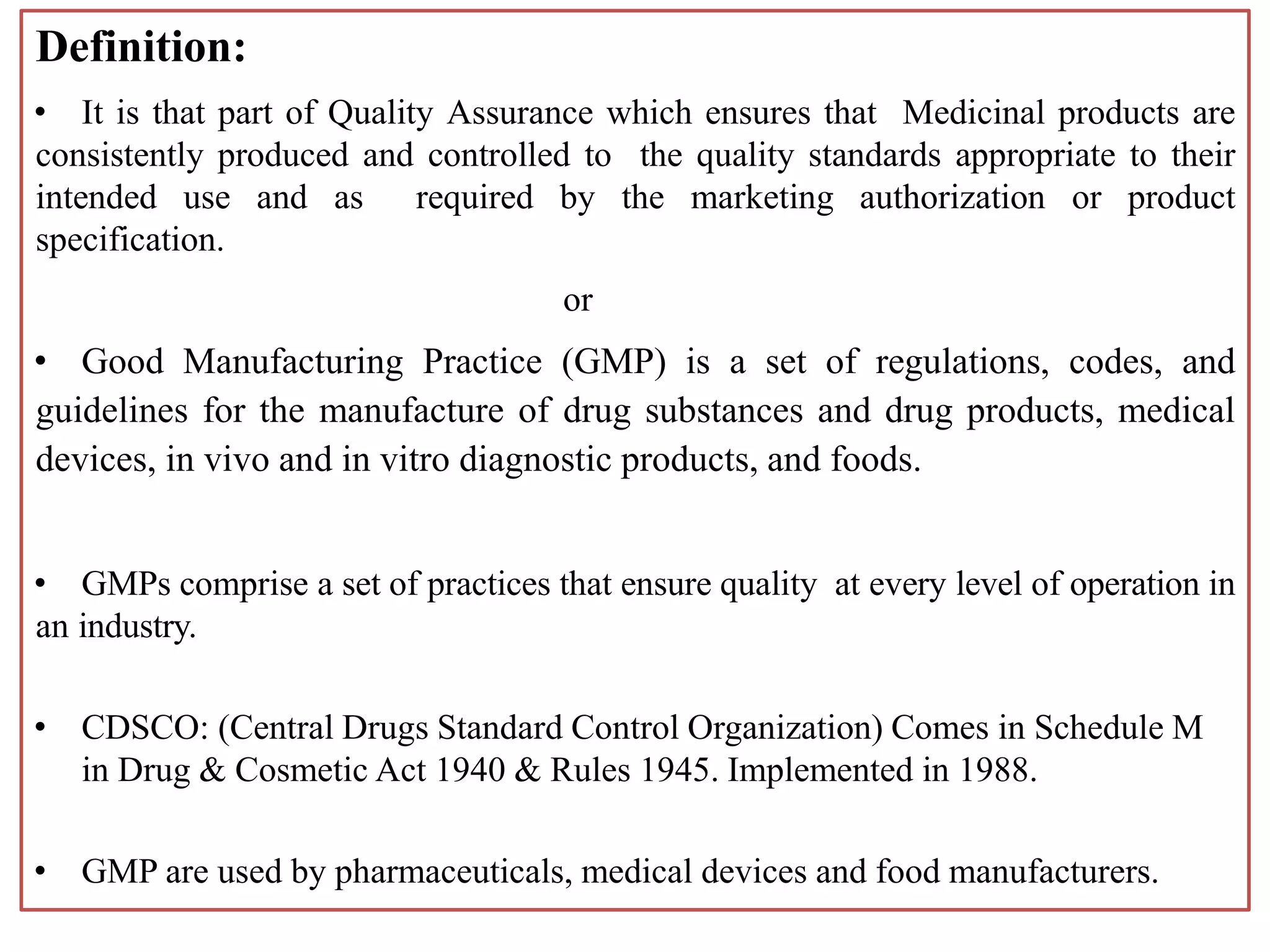 This document defines Good Manufacturing Practice (GMP) and outlines its history and key regulations. GMP is a set of guidelines for ensuring products are consistently produced and controlled according to quality standards for their intended use. Major developments include the 1962 Thalidomide tragedy leading to GMP regulations, and guidelines published by organizations like WHO, FDA, and other national regulatory agencies. The document describes key aspects of GMP including facilities, equipment, production processes, packaging and labeling, quality control, and record keeping.