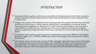 The document discusses GSM-based automated meter reading systems, highlighting their advantages in improving accuracy, efficiency, and cost-effectiveness compared to traditional methods. It describes the components used, including energy meters and Arduino, and offers insights into future research directions aiming for user-controlled monitoring and management of energy usage. Additionally, it addresses potential drawbacks and applications in domestic and industrial sectors.