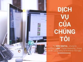 GMV Digital cung cấp giải pháp và dịch vụ tiếp thị trực tuyến, đóng vai trò là văn phòng marketing thuê ngoài cho doanh nghiệp. Chúng tôi thiết kế website và landing page chất lượng, đồng thời thực hiện các chiến lược SEO và Facebook marketing để giúp khách hàng tiếp cận hiệu quả với đối tượng mục tiêu trên internet.