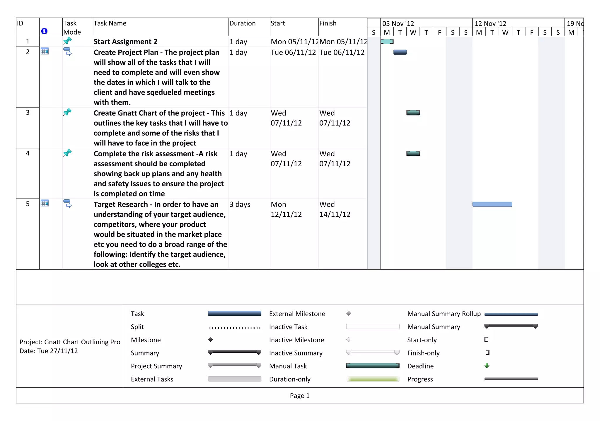 The document outlines a project plan with 16 tasks to produce an informational DVD. Key tasks include creating a project plan, risk assessment, questionnaire design, pre-production planning, filming, and keeping updated with the client. The Gantt chart schedules each task over a 16 day production phase from January 14th to February 4th, with potential delays due to weather or availability of the full team.