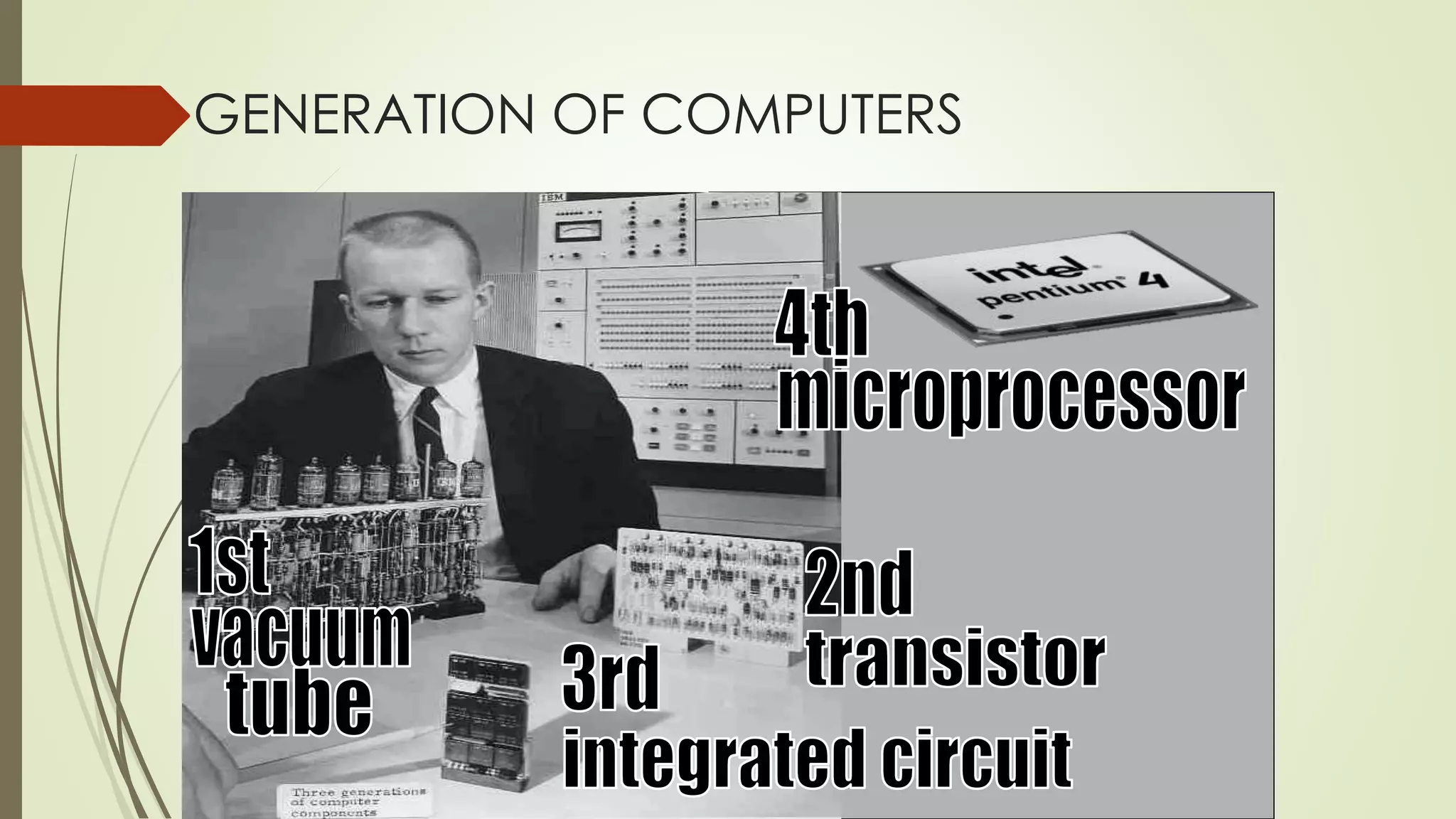 The document discusses the five generations of computers from the 1940s to present. The first generation used vacuum tubes and were very large, expensive, and consumed significant electricity. The second generation used transistors, which made computers smaller, more reliable, and efficient. The third generation used integrated circuits, making computers faster, smaller, cheaper, and more powerful. The fourth generation used microprocessors and microchips, resulting in smaller, more portable personal computers. The fifth generation involves artificial intelligence through technologies like robotics, speech recognition, and vision recognition.