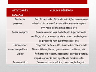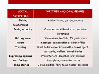 This document discusses genres and textual genres. It provides steps for a didactic sequence and analysis of texts, including context of production, linguistic-discursive aspects, and examples like Alice's Adventures in Wonderland. It also covers descriptive paragraphs on characters, elements of a good description, objective vs. subjective descriptions, and structures to include. Finally, it discusses an English festival project involving writing a sketch.