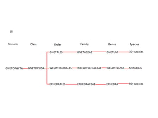 This document summarizes key characteristics of the plant division Gnetophyta. It describes three main genera within this division: Welwitschia, Ephedra, and Gnetum. Welwitschia is a bizarre desert plant found in Africa with only two strap-like leaves. Ephedra is a genus of small shrubs or vines found in dry areas worldwide. Gnetum includes about 30 tropical vine-like species. All three genera share some characteristics with flowering plants like vessel elements in xylem and double fertilization, distinguishing them from other gymnosperms.