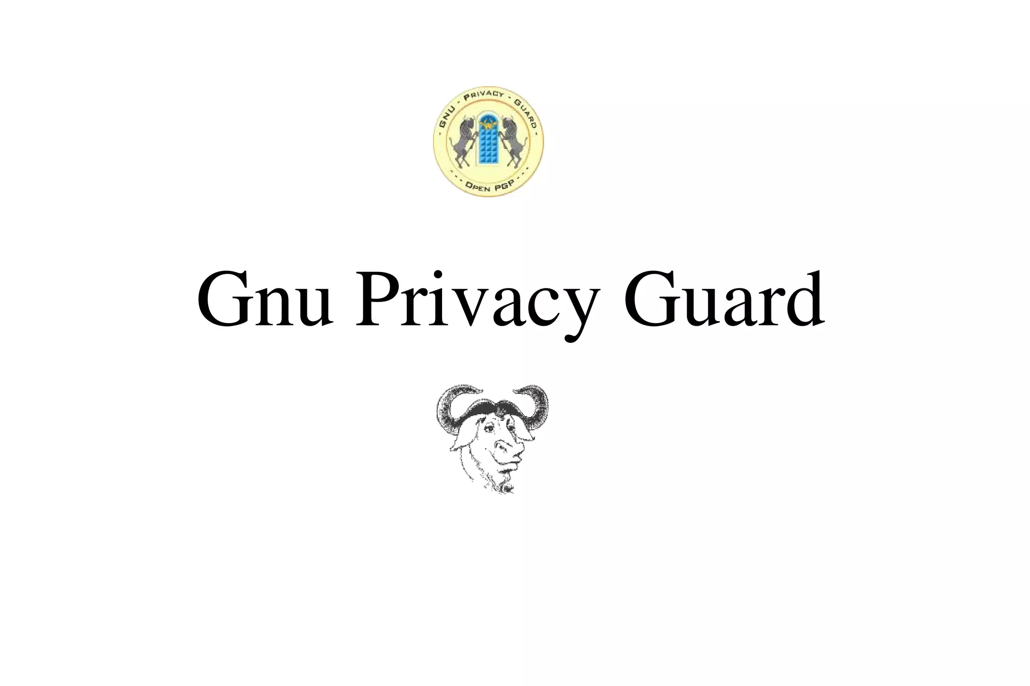 The document provides an overview of Gnu Privacy Guard (GPG), a free software replacement for PGP. It discusses generating and exchanging keys, encrypting and decrypting documents, and making and verifying signatures with GPG. The document also covers cryptographic concepts like symmetric and asymmetric ciphers, digital signatures, and how GPG implements a hybrid cryptosystem. Key management topics like validating keys, distributing keys, and managing trust are also outlined.