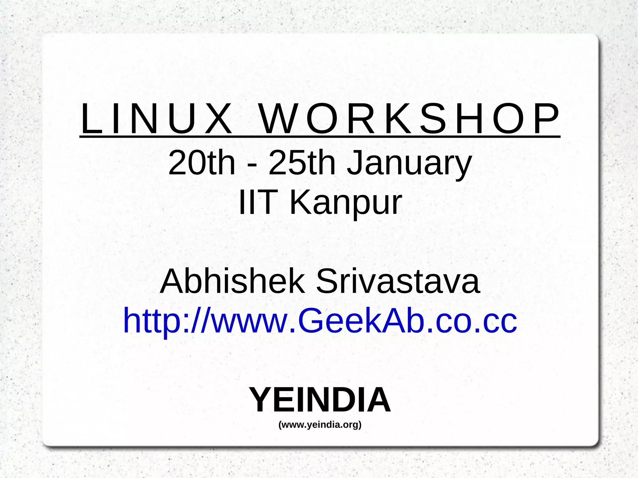 The document summarizes a Linux workshop covering topics like installation, file and user management, basic commands, shells, processes, software installation, hardware configurations, and an introduction to free and open source software (FOSS). It provides background on Linux and why organizations may want to migrate to it from other operating systems due to issues like crashing, viruses, vendor dependence and unpredictability. It also briefly explains what a boot loader and GRUB are and their roles in system startup.