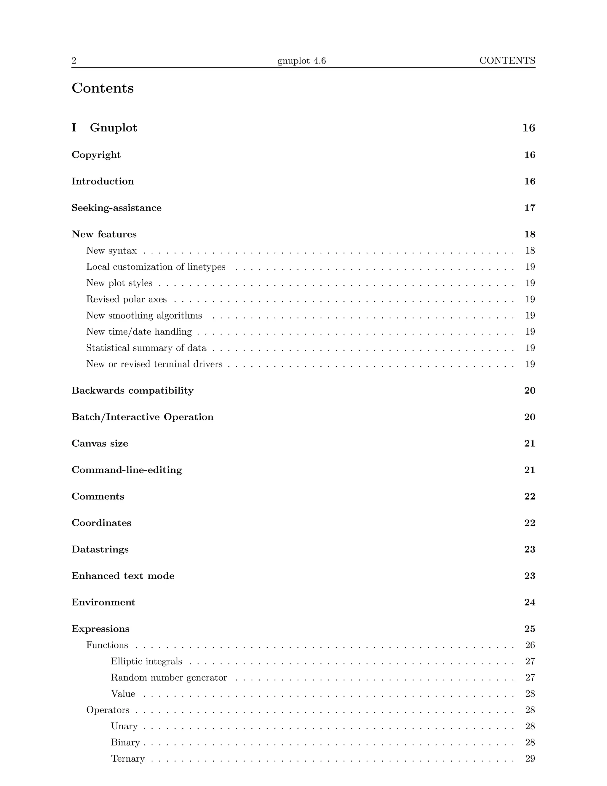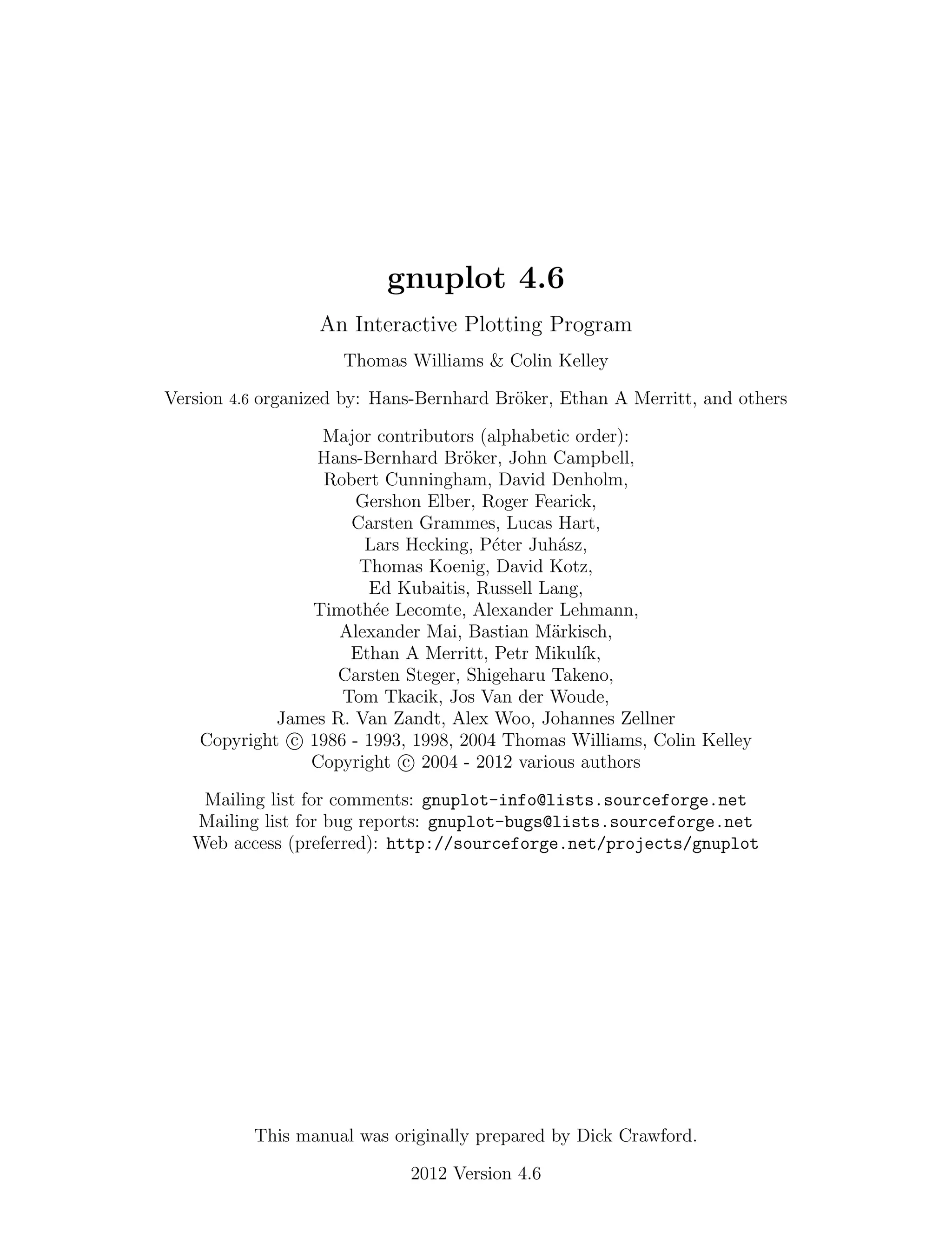 This document provides an overview of gnuplot version 4.6, an interactive plotting program. Major contributors to the 2012 version are listed alphabetically. This manual was originally prepared by Dick Crawford. The document contains two sections, with the first providing general information on gnuplot and the second describing various plotting styles available.