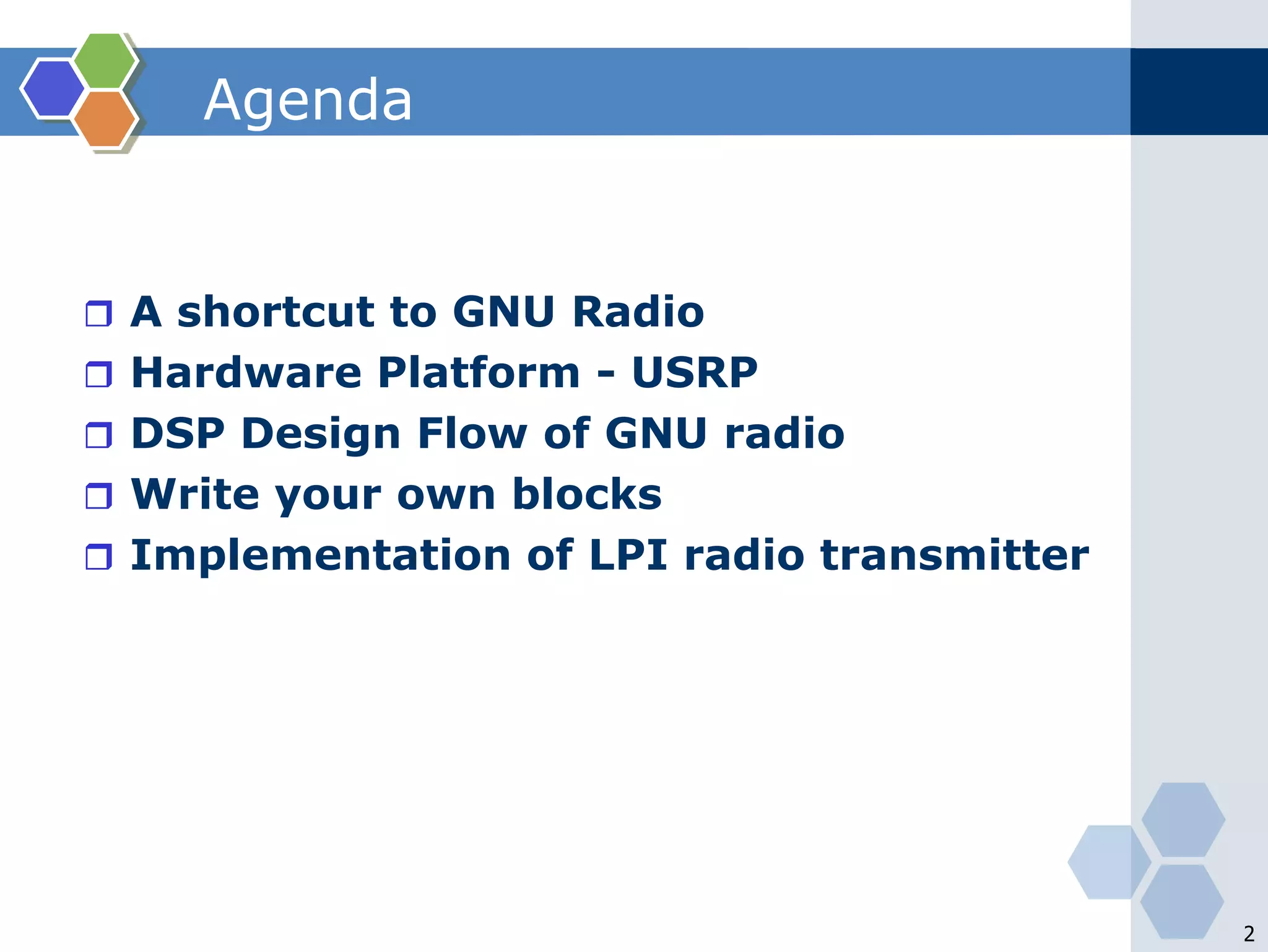 This document discusses implementing a low probability of intercept (LPI) radio transmitter using GNU Radio and a USRP radio hardware platform. It provides an overview of the system architecture, describing how GNU Radio software interfaces with the USRP hardware. It then outlines the DSP design flow, including writing custom signal processing blocks in C++. Finally, it details the implementation of the LPI radio transmitter, describing blocks for Manchester encoding, amplitude modulation using oscillators, and configuration of the USRP for transmission.