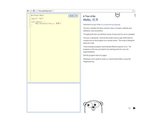 Go is a general-purpose, compiled language that is strongly typed, garbage-collected, and has explicit support for concurrent programming through goroutines and channels. Programs in Go are constructed using packages and the language provides standard types while also allowing functions to return multiple values.