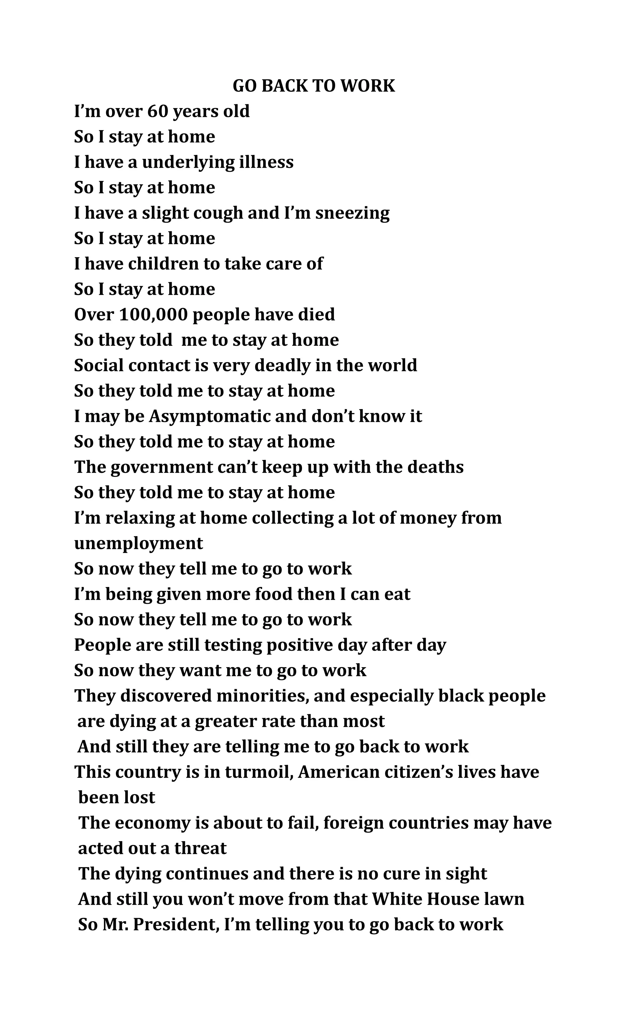 The document expresses concerns about being told to go back to work during the COVID-19 pandemic. It notes reasons for staying home such as being over 60, having underlying health conditions, children to take care of, and the ongoing risks of asymptomatic spread and high death rates that suggest it is still not safe to return to normal activities. It concludes by telling the president that since the risks are still so great, he should lead by example and go back to work himself.