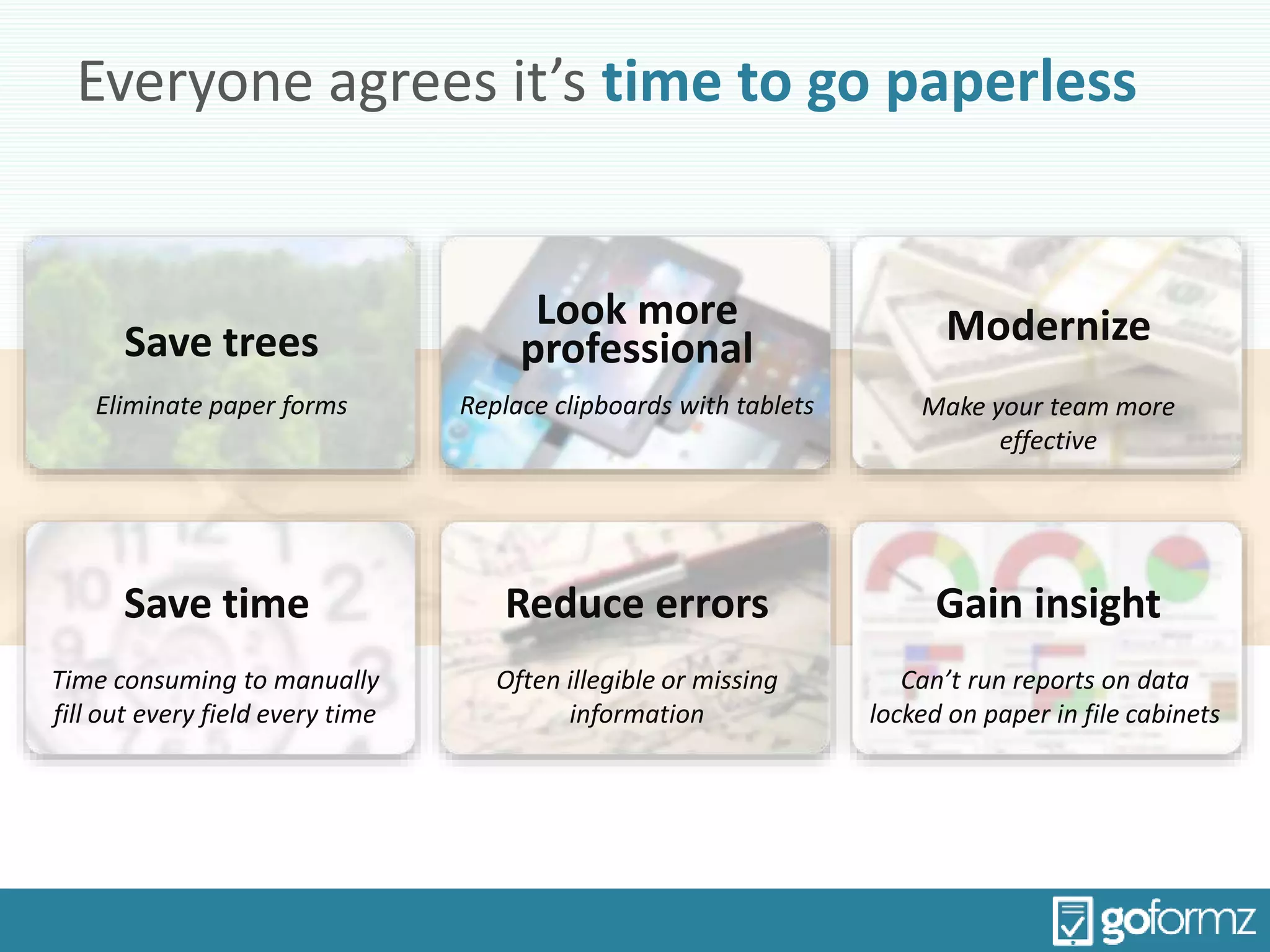 - GoFormz allows users to upload existing paper forms directly into the app, so it requires no retraining for users. Forms look and function the same as the paper versions.