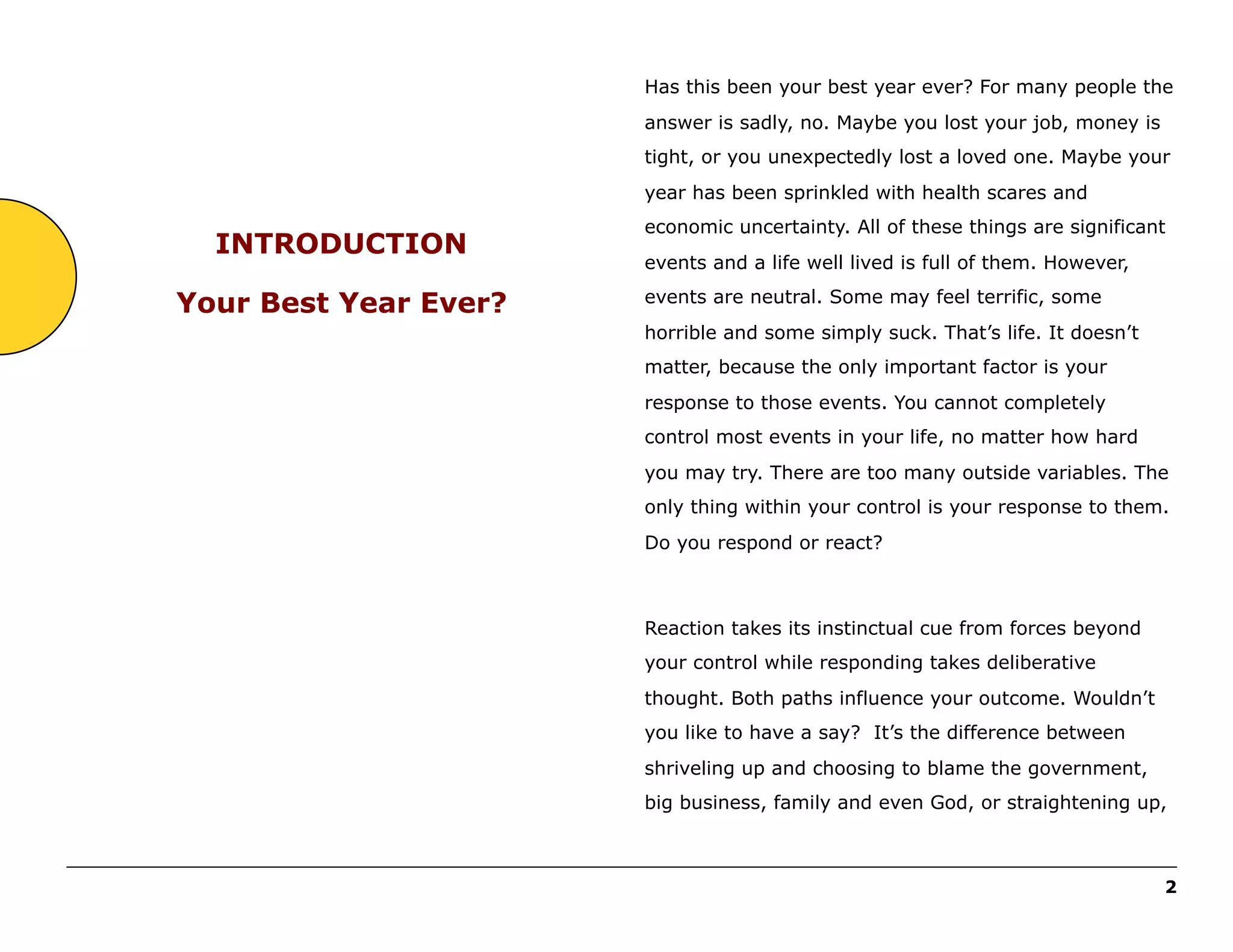 This document provides guidance on finding purpose and setting goals. It encourages the reader to reassess their current goals and life situation, renew their desires, and repair broken things. It also discusses responding positively to life events rather than reacting, and provides a brief story about different responses to a snake bite that represents how people respond to challenges. The document promotes taking action on goals, noticing if it's working, and trying something different if it's not working. It suggests visualizing success and asking reflective questions to maintain a positive mindset.