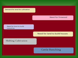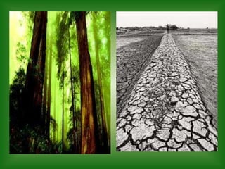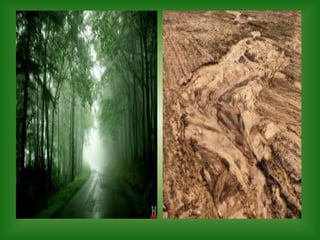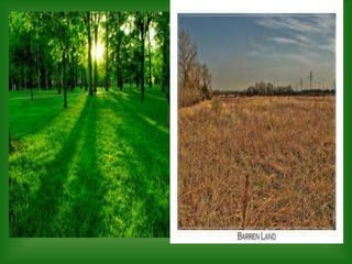 This presentation discusses the negative effects of deforestation such as destruction of carbon sinks, soil erosion, loss of medicinal plants, greenhouse effect, global warming, impacts on the water cycle, loss of biodiversity, and climate change. It recommends measures to address deforestation like growing trees, spreading awareness, recycling, following crop rotation, and promoting a green lifestyle by loving plants, welcoming green spaces, and being thankful for trees.