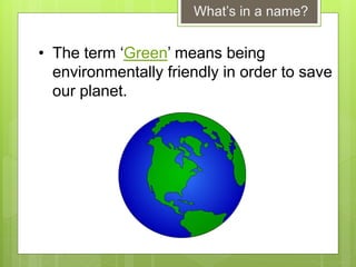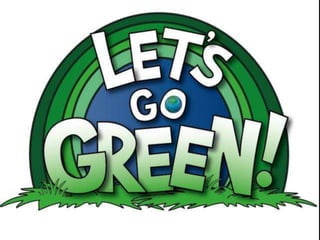This document discusses going green and encourages students to think about how to encourage others to be more environmentally friendly. It suggests creating a Y chart about what going green means, watching a video that teaches how to go green through song, discussing as a think pair share what the world would be like without environmental protection, designing a creative recycling bin to reduce littering, and provides references for further information.