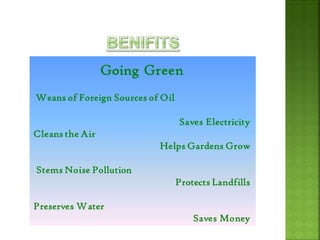 The presentation by Nilakshi Sharma emphasizes the importance of going green, outlining its principles and benefits, including environmental, economic, and health advantages. It highlights the need for sustainable living to combat global warming and preserve natural resources. Key initiatives mentioned include the Swachh Bharat Abhiyan and the Clean Ganga Mission, reinforcing the urgency of adopting eco-friendly practices.