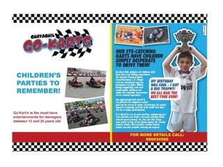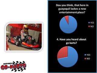 The document summarizes a business plan for a go kart racing entertainment business called "Go Karts" that aims to provide adventure and risk-taking for youth ages 15-35. It outlines the company structure, marketing research on customers, financial projections, and marketing plan including pricing, placement, product details, and promotional strategies.