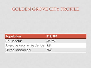 The presentation provides a profile of Golden Grove city which has a population of 218,381 people with 62,394 households and residents who have lived in the city for an average of 6.8 years. 75% of households are owner occupied. The city has a vibrant economy, growing population, and community loyal to local merchants. A new town center opening next year is licensed for 16 new food establishments and offers early lease signing bonuses to restaurants.