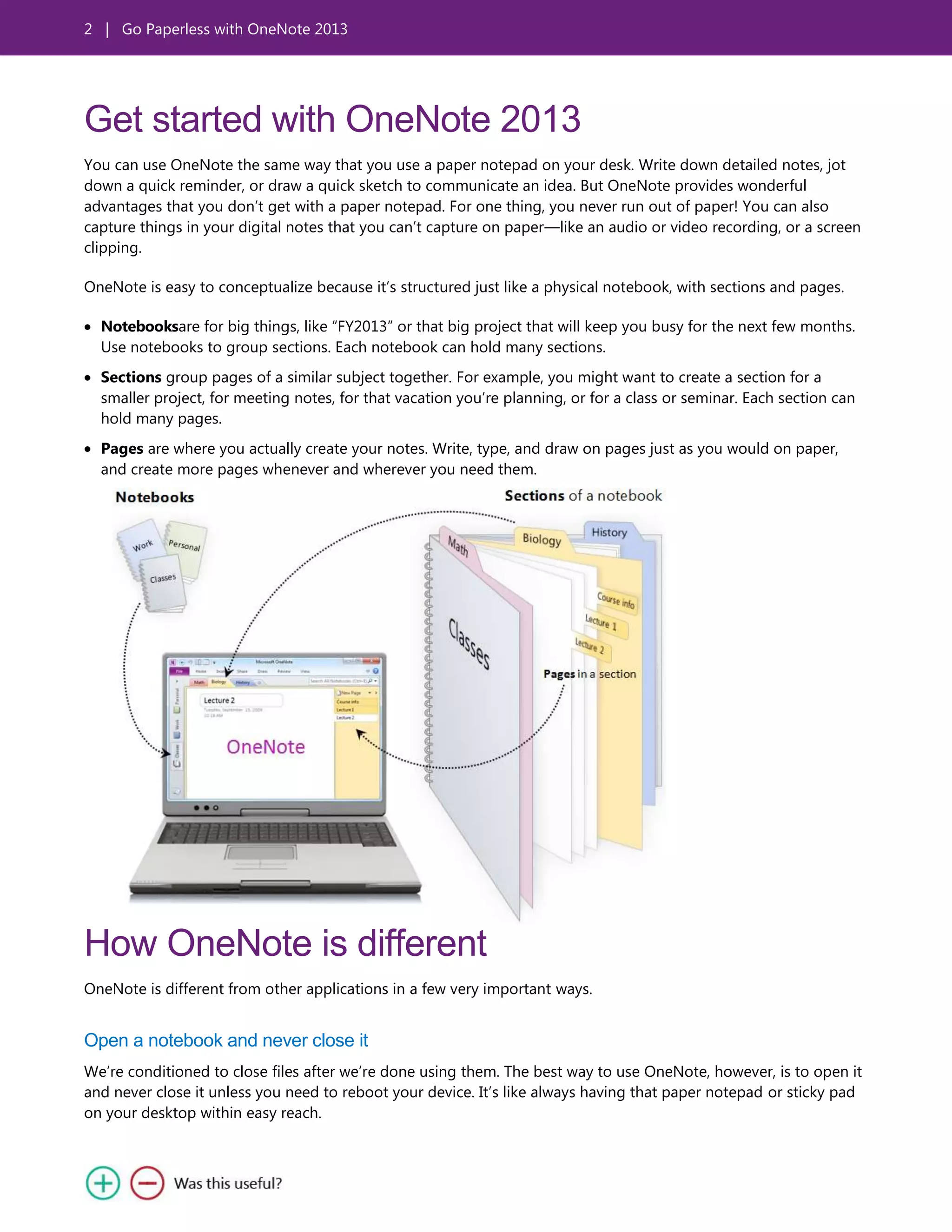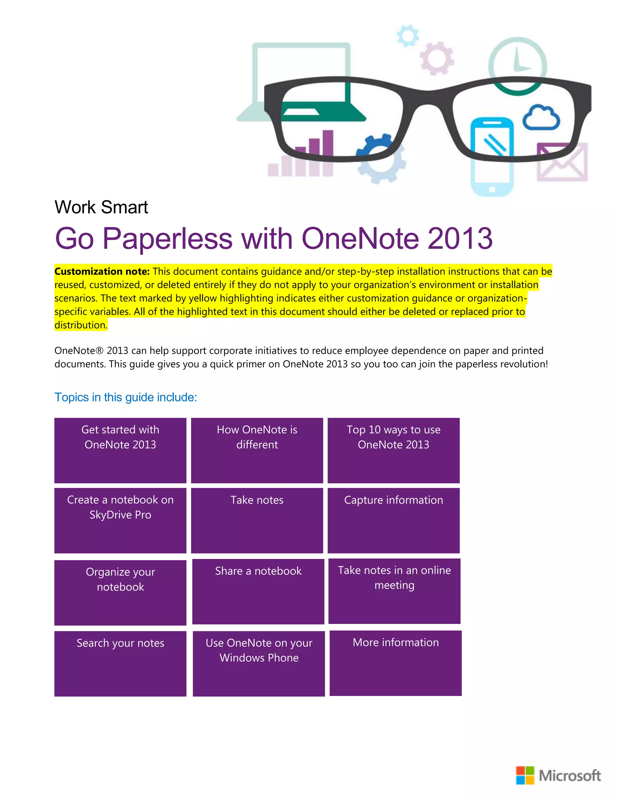 This document provides guidance on using OneNote 2013 to go paperless. It discusses how OneNote allows for capturing information digitally that can't be captured on paper, like audio or video recordings. It then provides an overview of the key aspects of OneNote, including notebooks, sections, and pages for organizing notes. Finally, it gives examples of how OneNote can be used, such as reviewing documents, taking meeting notes, and creating to-do lists.