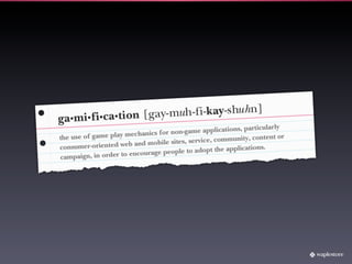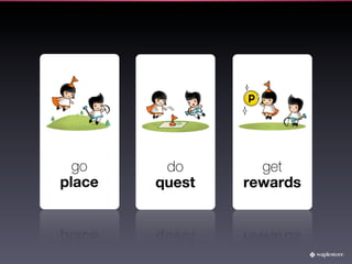 Waplestore is developing a location-based social network game (LBSNG) called "Quest+" that utilizes gamification principles. Users can complete quests at real-world points of interest (POIs) to earn rewards like points and levels. The game is built on an open platform with APIs for building customizable quests, analyzing user statistics, and integrating advertising. Waplestore hopes to partner with social/mobile game companies, local businesses, publishers and advertisers to expand the platform and cross-promote between real and virtual places. They demonstrated a prototype and are looking for feedback and potential partners.