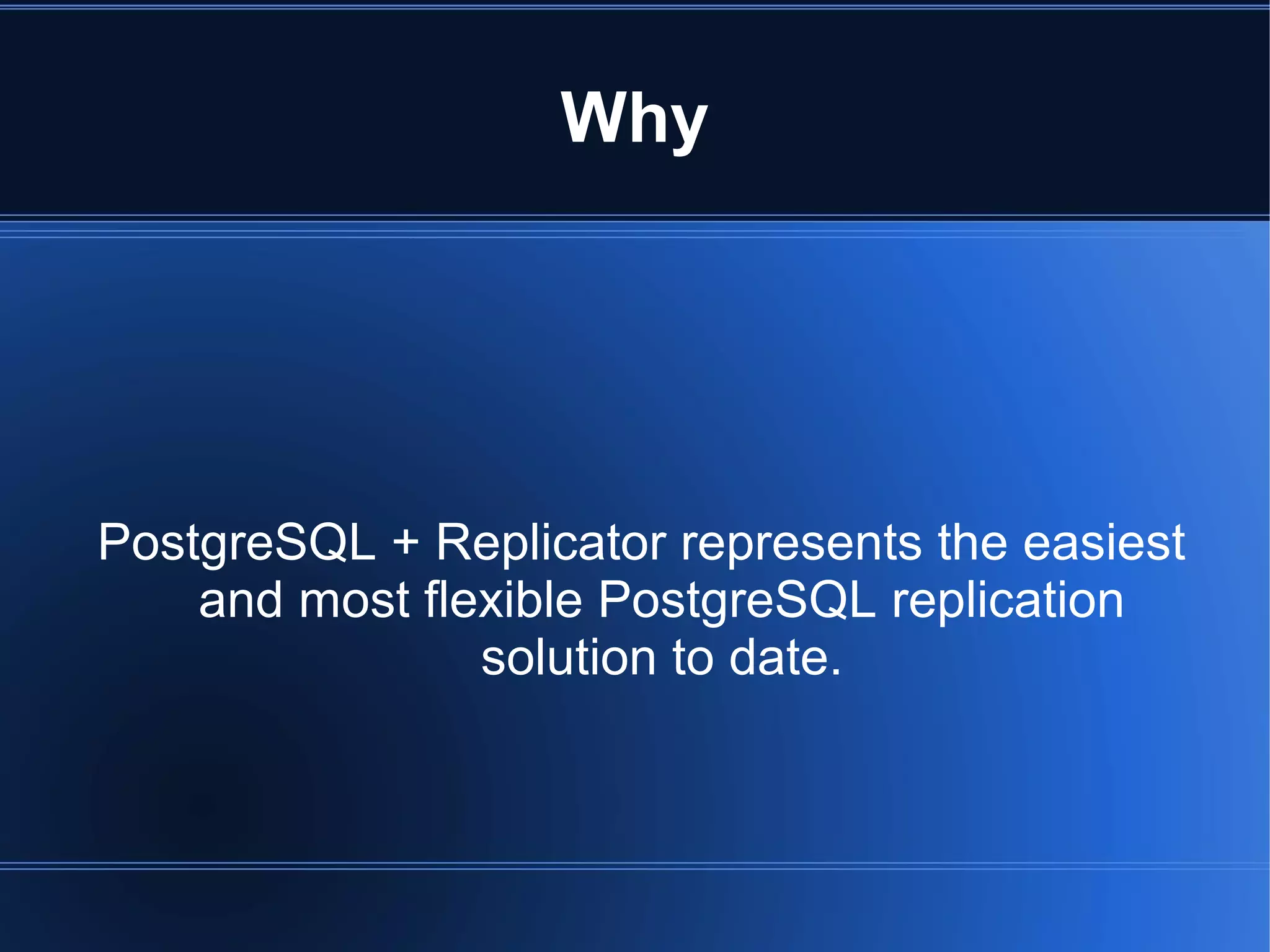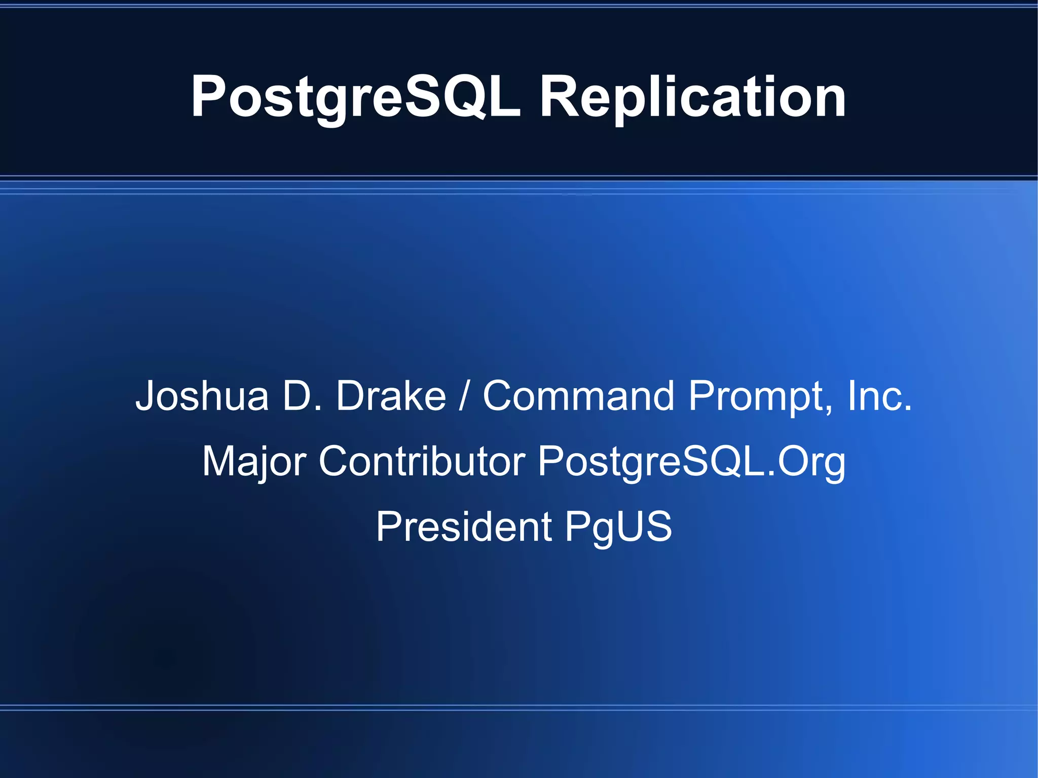 PostgreSQL Replication describes PostgreSQL Replicator, an open source solution for replicating PostgreSQL databases. Key features include asynchronous replication from a master to multiple slaves, supporting various replication types like role, grant, and large object replication without triggers. Replicator uses a Master Control Process to manage replication between nodes. It allows unlimited slaves without impacting the master and operates on any server.