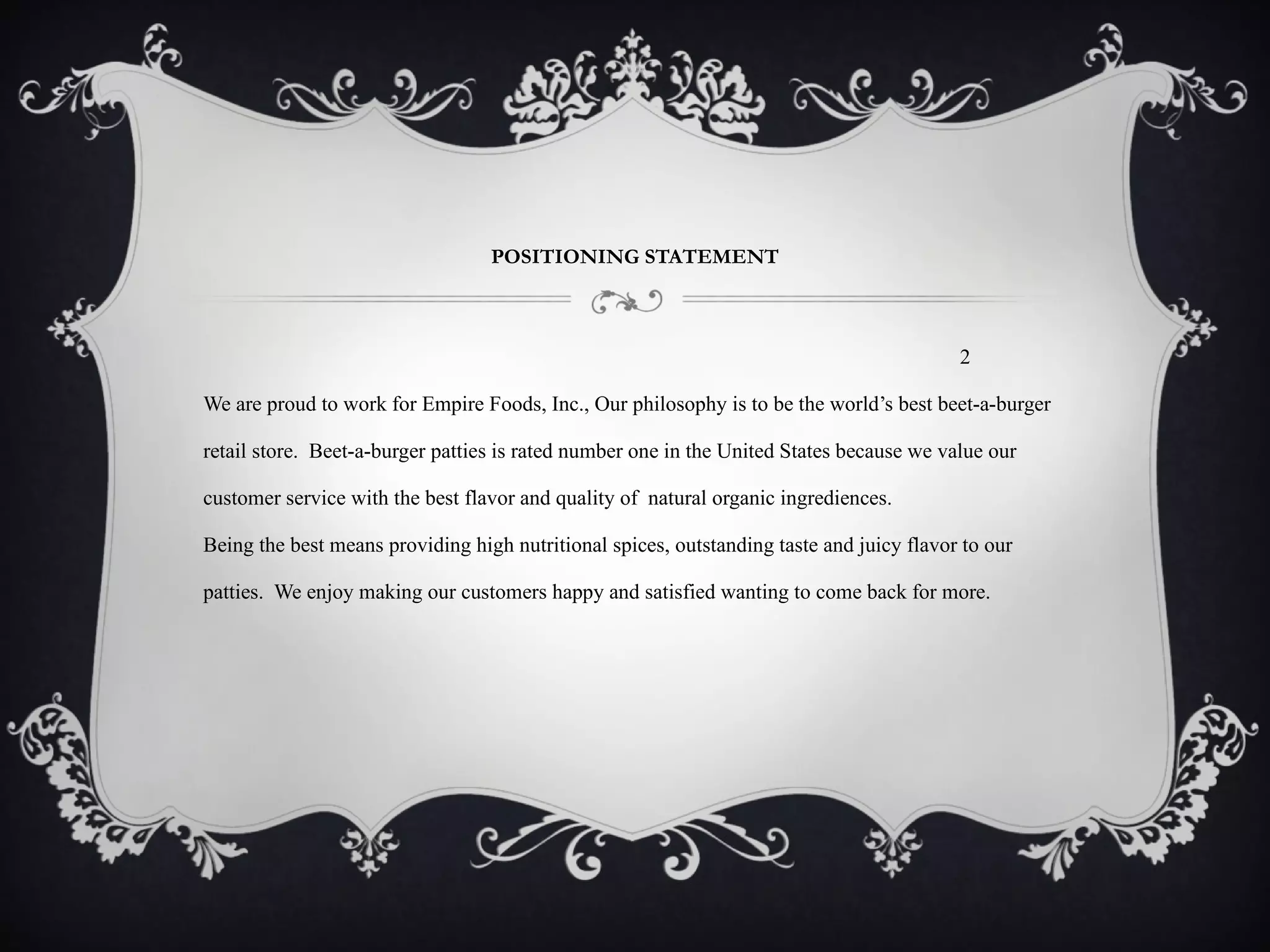 The document summarizes the marketing plan for Empire Foods' beet-a-burger patties. Empire Foods aims to be the world's best beet-a-burger retail store by providing high quality, organic ingredients and excellent customer service. Their target market is responsible consumers looking for nutritious products. Beet-a-burgers contain fresh, home-grown ingredients like tomatoes, beets, and tofu cheese. While more expensive than competitors, Empire Foods believes their higher quality products and customer focus will make them the best brand.