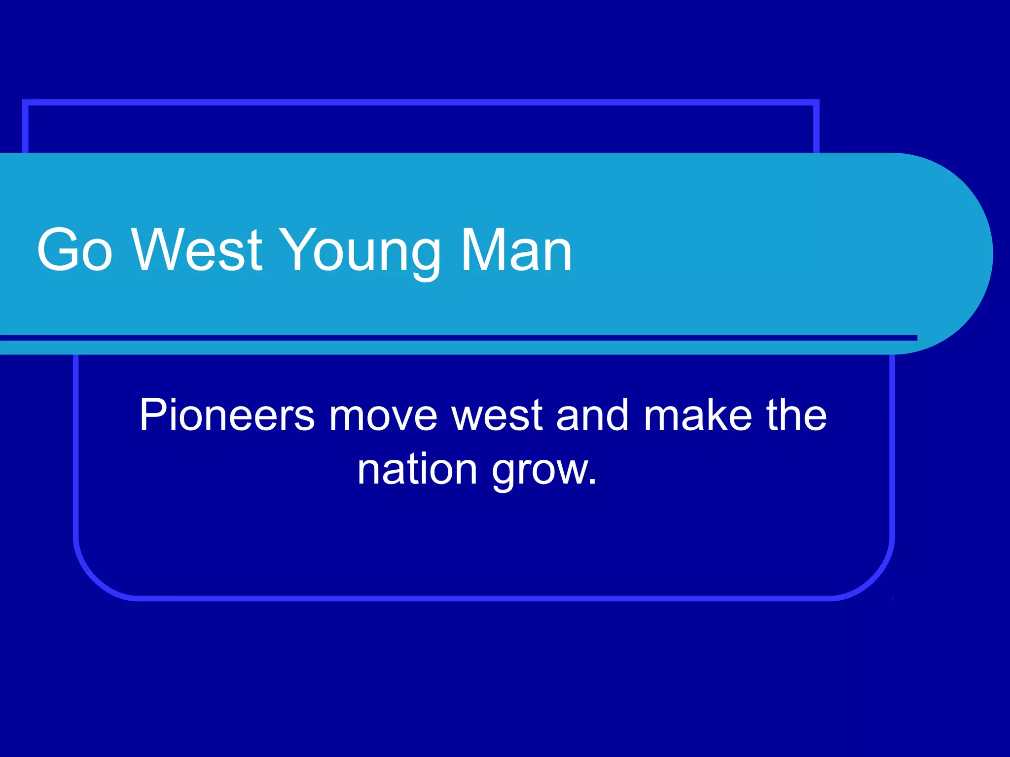This document summarizes westward expansion in the United States from the late 1700s to the mid-1800s. It describes how pioneers moved past the Appalachian Mountains through passages like the Cumberland Gap and settled new territories and states. Major developments that encouraged further western migration included the Louisiana Purchase, the Lewis and Clark Expedition, and completion of the Erie Canal. The document outlines the use of river transportation and wagon trains along routes like the Oregon Trail to settle lands beyond the Mississippi River, including territories in the Rocky Mountains and Pacific Northwest.