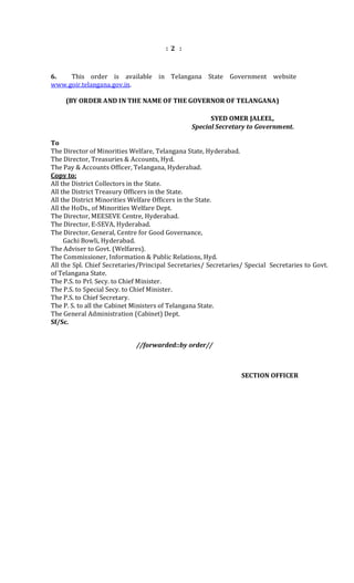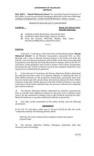 The Telangana government has introduced the 'Shaadi Mubaarak Scheme' to provide financial assistance of Rs. 51,000 to unmarried girls from minority communities at the time of their marriage, effective from October 2, 2014. A modification has been made allowing additional evidence for age proof, such as voter ID, ration cards, or Aadhaar cards, due to difficulties in obtaining birth certificates. The Director of Minorities Welfare has been instructed to implement this amendment.
