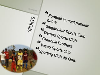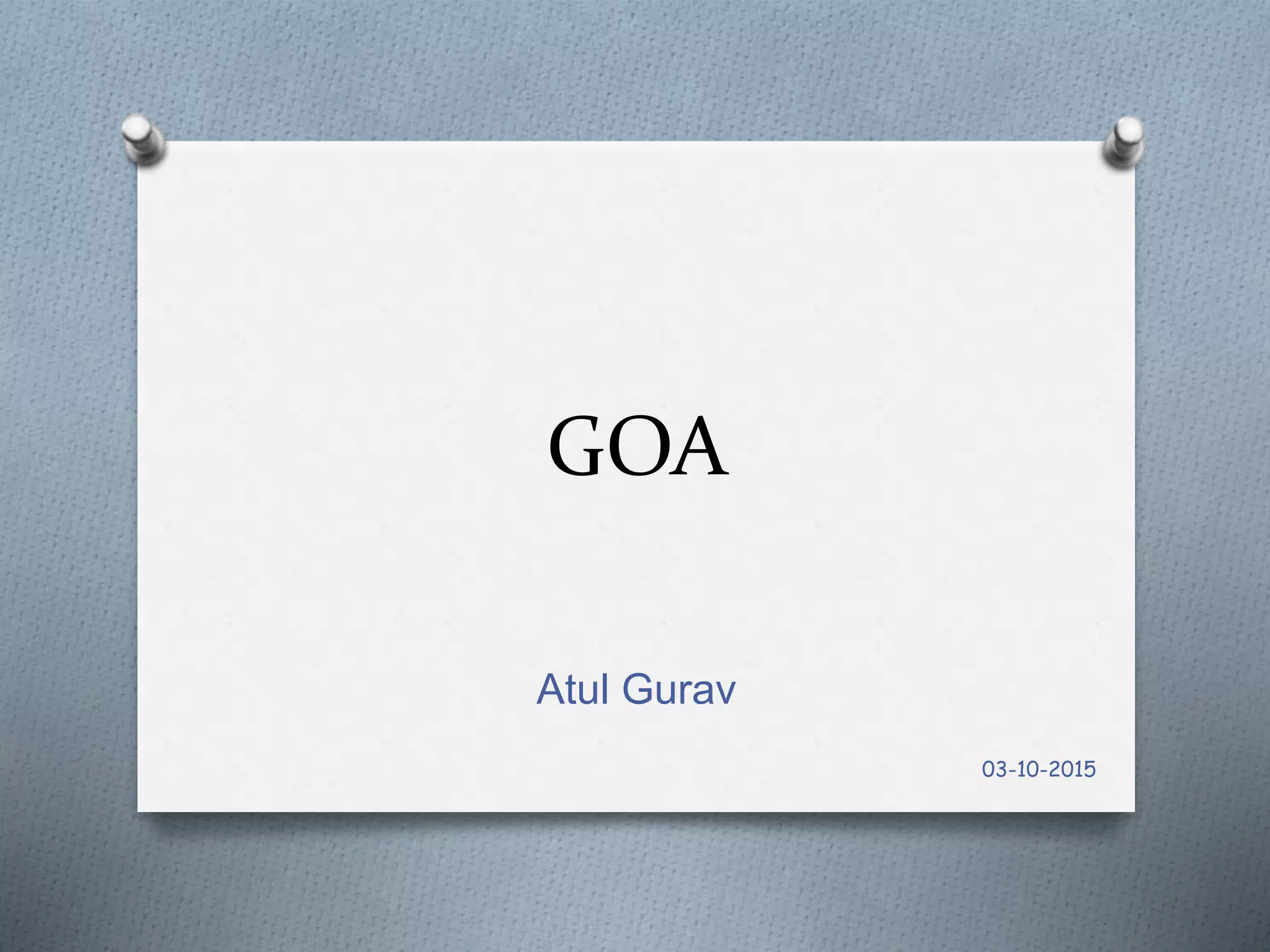 Goa is a small state located on India's west coast along the Arabian Sea. It has a long history of rule under various kingdoms and was a Portuguese colony for over 450 years. Tourism is now the primary industry, focused around its beaches, churches, temples, and other attractions. The population is a mix of Hindu and Christian faiths and speaks Konkani as the main language.