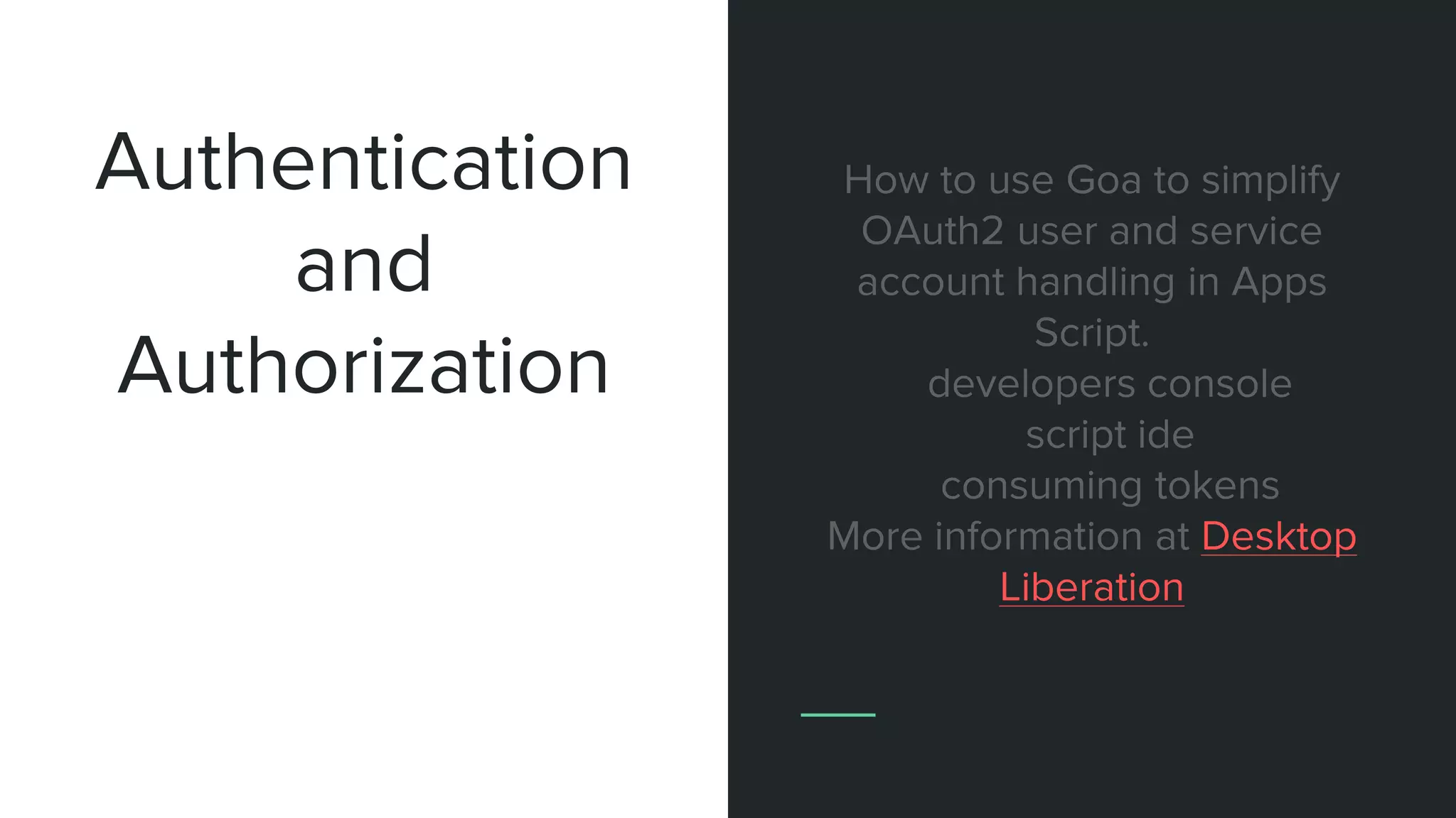 The document outlines how to set up OAuth2 authentication and authorization using Google Apps Script and the GOA library, detailing steps for both user and service account handling. It provides instructions on configuring the Google Developers Console, creating credentials, and using access tokens within Apps Script projects. Additionally, users can reference further resources and capabilities available for setting up for various API providers through Desktop Liberation.