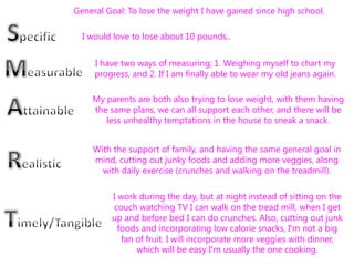 Caryn set a goal to lose 10 pounds with support from her parents who also wanted to lose weight. She planned to measure her progress by weekly weigh-ins and fitting into old jeans. Her plan was to cut out junk food, add more vegetables, and do daily crunches and treadmill walks. While sick twice and unable to exercise as planned, she still lost 8 pounds through better eating. Though she has yet to reach her goal, she is motivated to lose a few more pounds and stay fit.