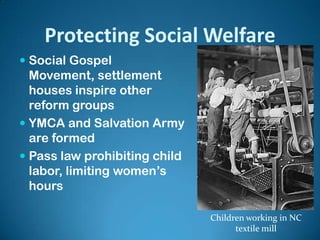 The Progressive Movement aimed to remedy issues stemming from industrialization and urbanization through social, political, and economic reforms. Led by white, middle-class reformers in the late 19th/early 20th century, the movement sought to address problems with welfare, morality, economic policy, and corruption through initiatives like settlement houses, prohibition, trust-busting, consumer protections, and election reforms promoting direct democracy.